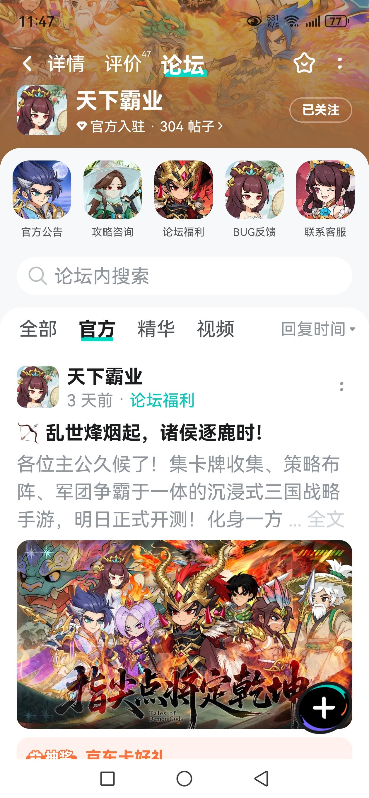 你是否曾幻想过身披战甲,与曹刘孙三分天下?你是否渴望集结五虎上将、卧龙凤雏,打造专属梦之队?现在,这款集卡牌收集、策略布阵、军团争霸于一体的三国手游,邀你亲历波澜壮阔的史诗!🎁 福利预警!京东卡免费送! 🎁为感谢各位诸侯的期待,即日起参与该活动,即有机会赢取 100 元京东卡!▶ 参与方式1.点击预约《天下霸业》并发新帖晒截图2.在本帖下方评论区分享发帖链接即可【奖品发放】到