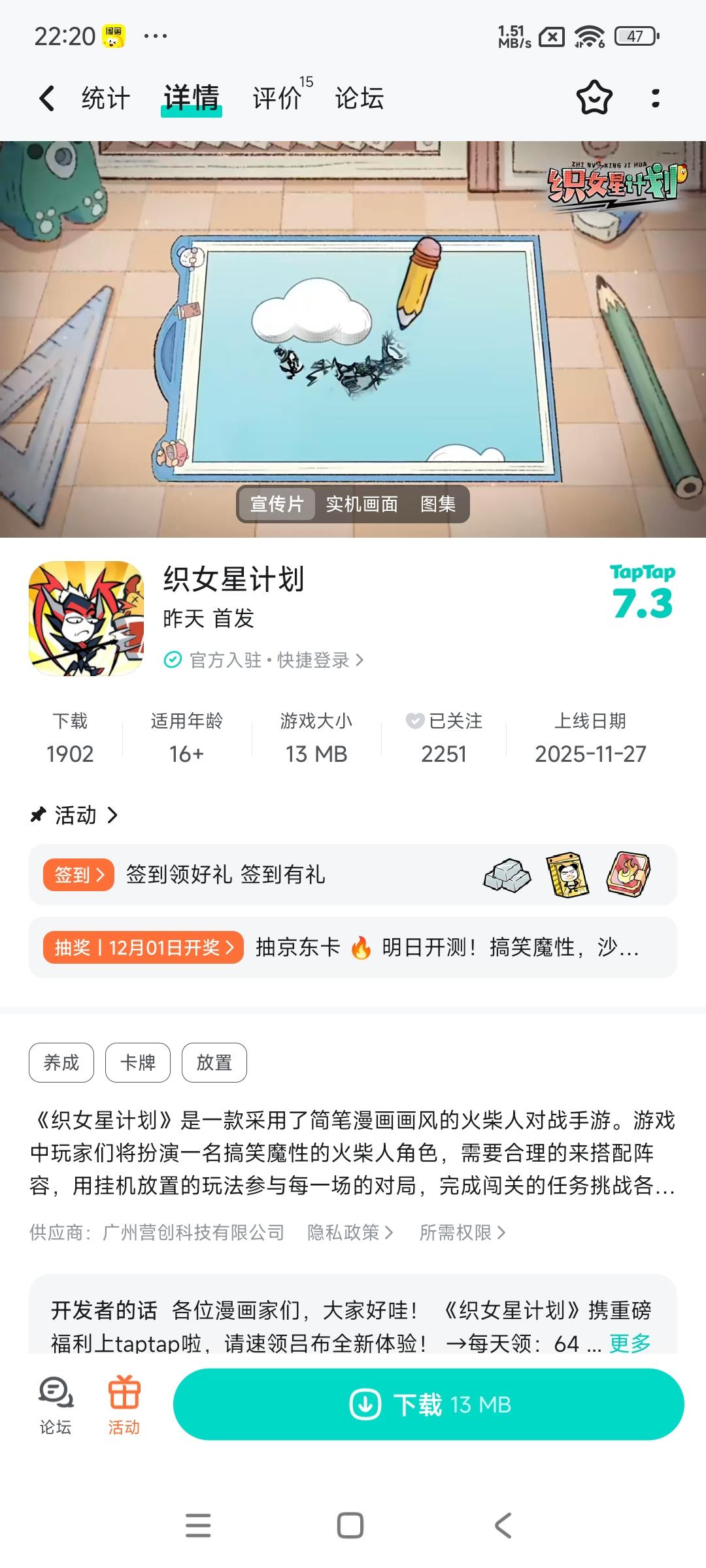 恭喜下面三位绘画家中奖,中奖的用户可在72小时内添加客服QQ,提供中奖凭证+tapID截图联系客服领取~【客服QQ】3515425294【官方Q群】964476899《织女星计划》是一款采用了简笔漫画画风的火柴人对战手游。游戏中玩家们将扮演一名搞笑魔性的火柴人角色,需要合理的来搭配阵容,用挂机放置的玩法参与每一场的对局。游戏中搞笑的角色人设以及沙雕无厘头的剧情,能够带给玩家们无尽的欢乐,感受