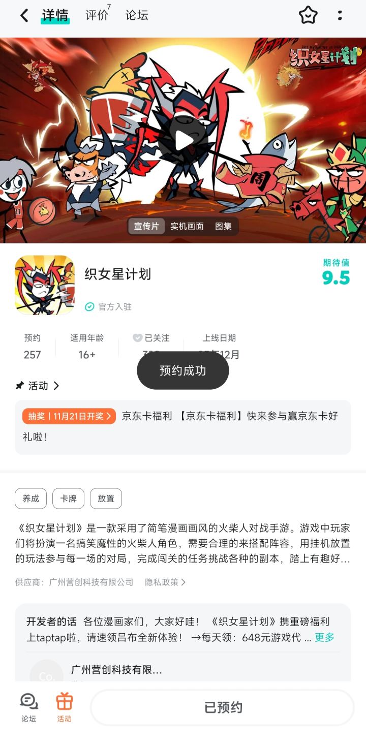 恭喜下面三位绘画家中奖,中奖的用户可在72小时内添加客服QQ,提供中奖凭证+tapID截图联系客服领取~【客服QQ】3515425294【官方Q群】964476899《织女星计划》是一款采用了简笔漫画画风的火柴人对战手游。游戏中玩家们将扮演一名搞笑魔性的火柴人角色,需要合理的来搭配阵容,用挂机放置的玩法参与每一场的对局。游戏中搞笑的角色人设以及沙雕无厘头的剧情,能够带给玩家们无尽的欢乐,感受