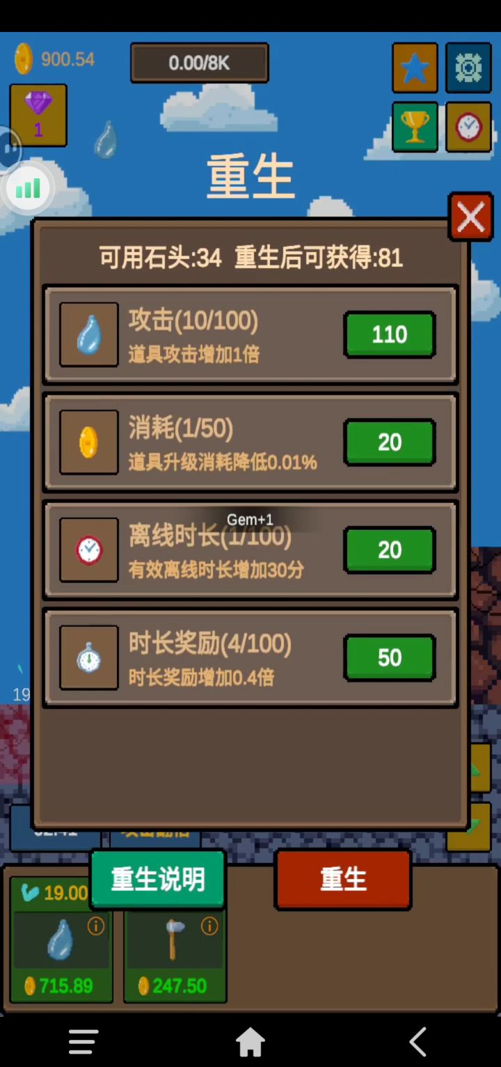 重生可以获得重生点数,来增加攻击、消耗、离线时长、时长奖励四项属性,且重生不会重置等级。