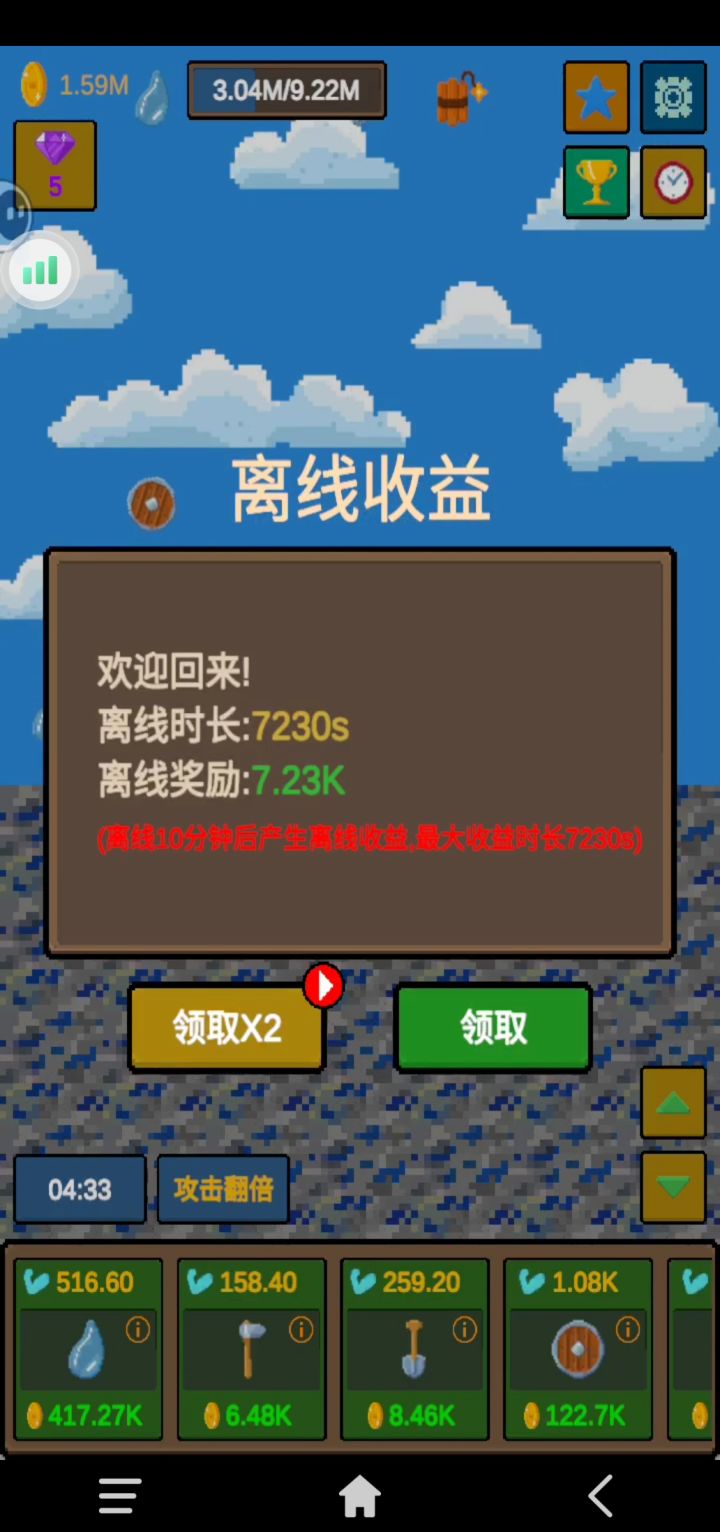 2D像素风美术品质一般,只有一屏的内容,上下可以按箭头查看深度。界面结构有些简单,UI品质一般。胡乱按的水滴落下似下雨般,对应点击的方块线路,或者也可以直线挖掘,做成真正的水滴石穿。不过顶部如果还有砖头的话,是无法向同屏下面挖掘太深的,摄像机不会跟随。各种武器攻击的时候有动画表现,也有音效效果。