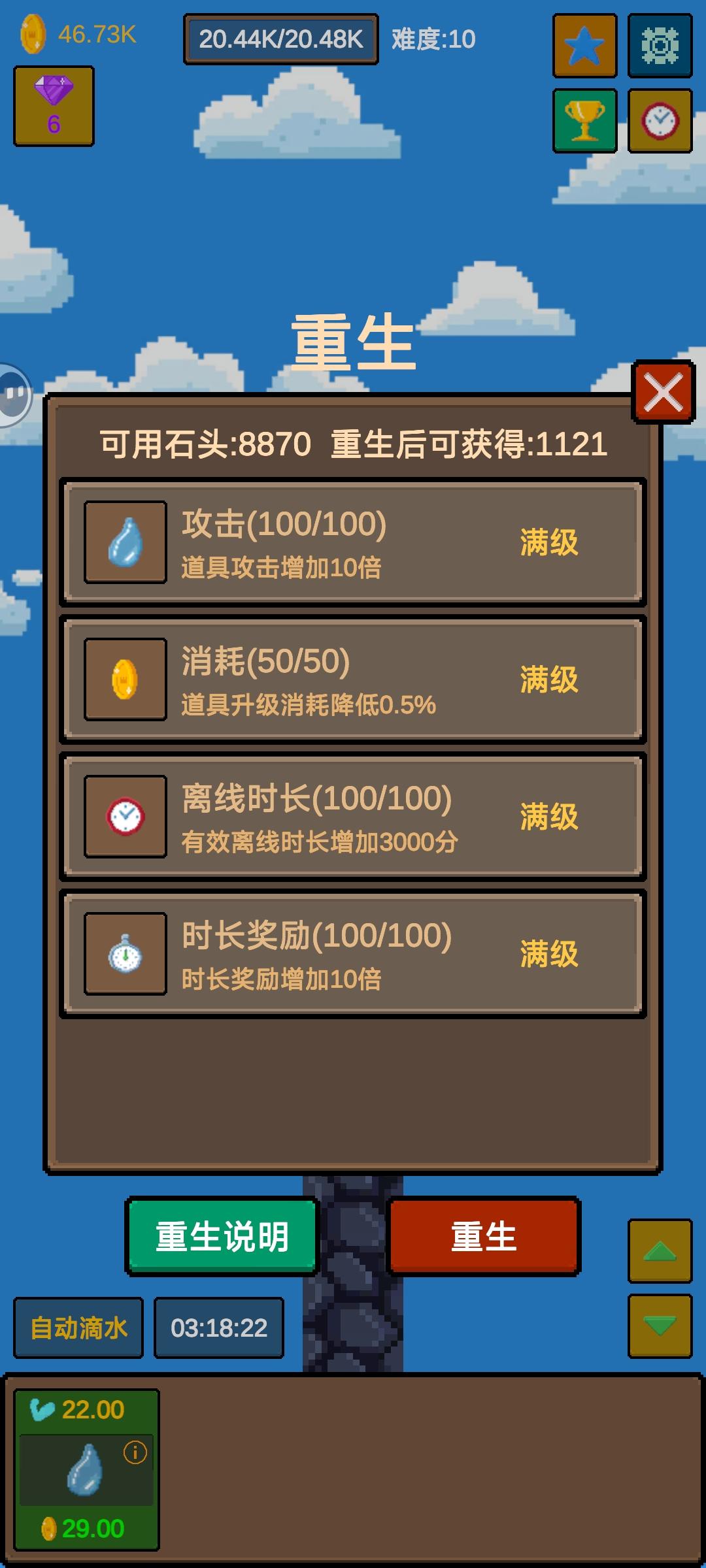 没什么可玩性,纯浪费时间。难度一结束后就都是重复了,技能钻石都是会重置的升级没什么用,挂机的时间也很短。要石头也很简单打个几分钟重生,就这样一直重生就可以了。就这些打完就没必要玩了,后面都是重复的。