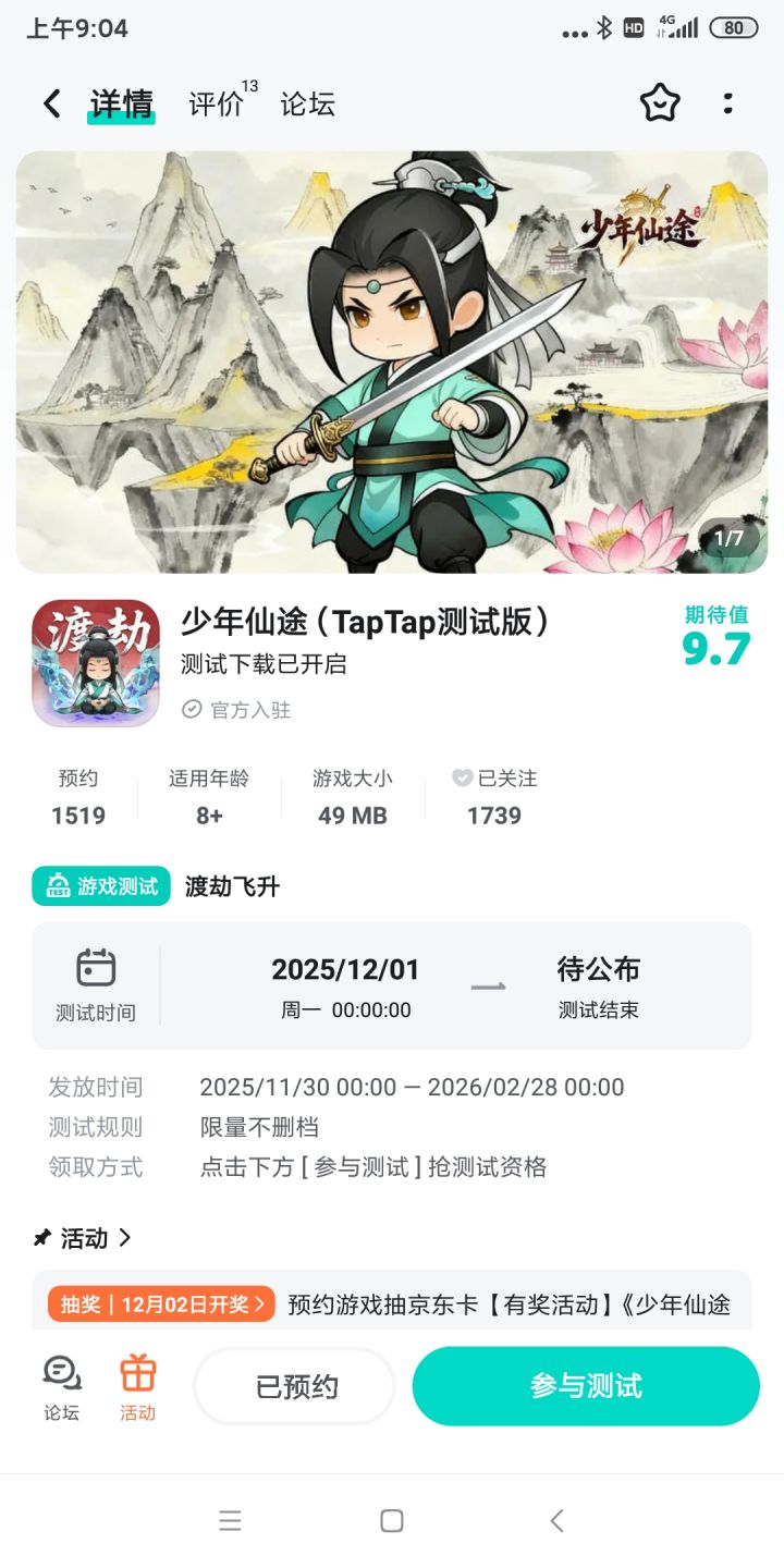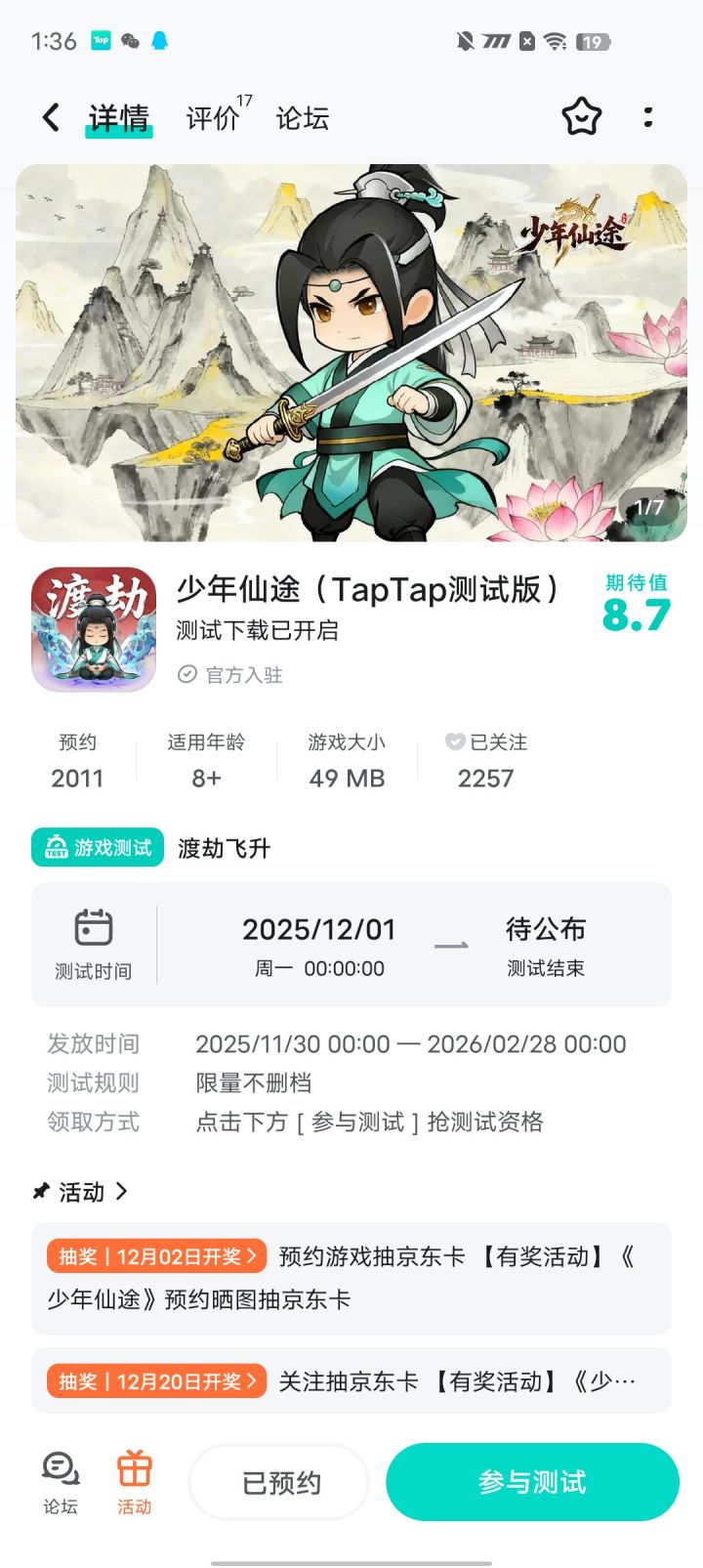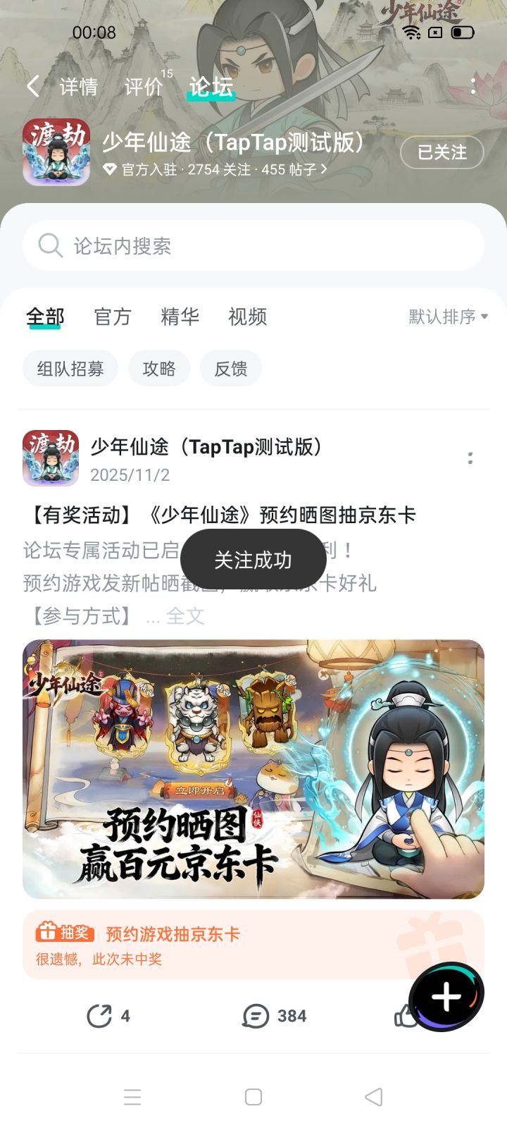 论坛专属活动已启,速来参与赢福利!预约游戏发新帖晒截图,赢取京东卡好礼【参与方式】1.点击关注预约《少年仙途》并发新帖晒截图2.在本帖下方评论区分享发帖链接即可【活动时间】即日起至12月2日【活动奖励】随机抽取1名符合参与条件的玩家获得:50元京东卡一张【活动规则】1.内容禁止涉及暴力、色情、政治、恐怖内容,违者做删帖处理并取消活动资格;2.回复内容需与活动主题相关,若抽中楼