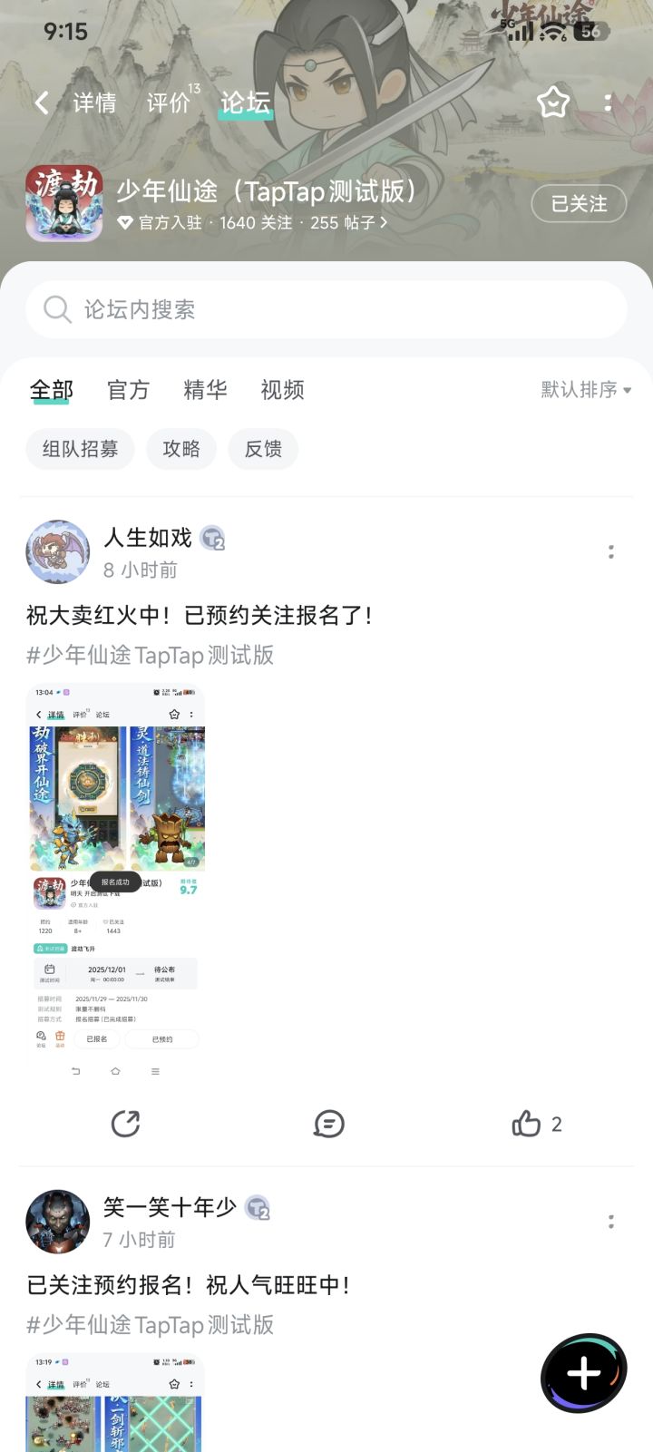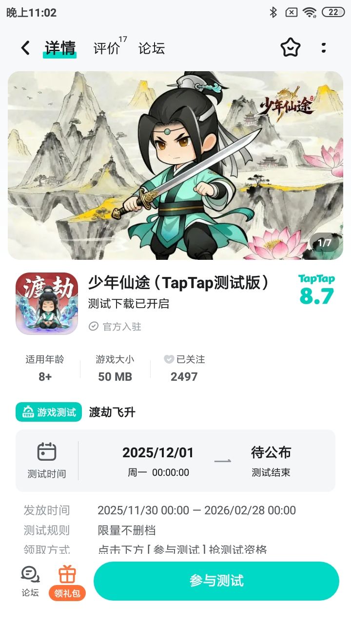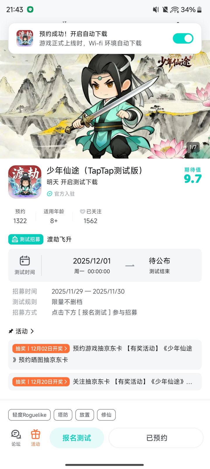 论坛专属活动已启,速来参与赢福利!预约游戏发新帖晒截图,赢取京东卡好礼【参与方式】1.点击关注预约《少年仙途》并发新帖晒截图2.在本帖下方评论区分享发帖链接即可【活动时间】即日起至12月2日【活动奖励】随机抽取1名符合参与条件的玩家获得:50元京东卡一张【活动规则】1.内容禁止涉及暴力、色情、政治、恐怖内容,违者做删帖处理并取消活动资格;2.回复内容需与活动主题相关,若抽中楼