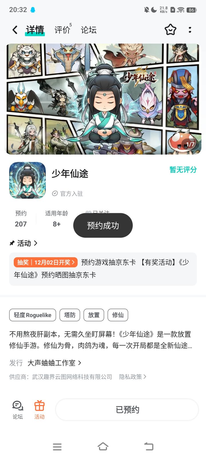 创新融合玩法!塔防+修仙+肉鸽+背包乱斗,全新体验!御剑巡三界,道法破苍穹发新帖晒截图,赢取京东卡好礼!【参与方式】1.点击关注《少年仙途》并发新帖晒截图2.在本帖下方评论区分享发帖链接即可【活动时间】即日起至12月20日【活动奖励】随机抽取1名符合参与条件的玩家获得:50元京东卡一张【活动规则】1.内容禁止涉及暴力、色情、政治、恐怖内容,违者做删帖处理并取消活动资格;2.