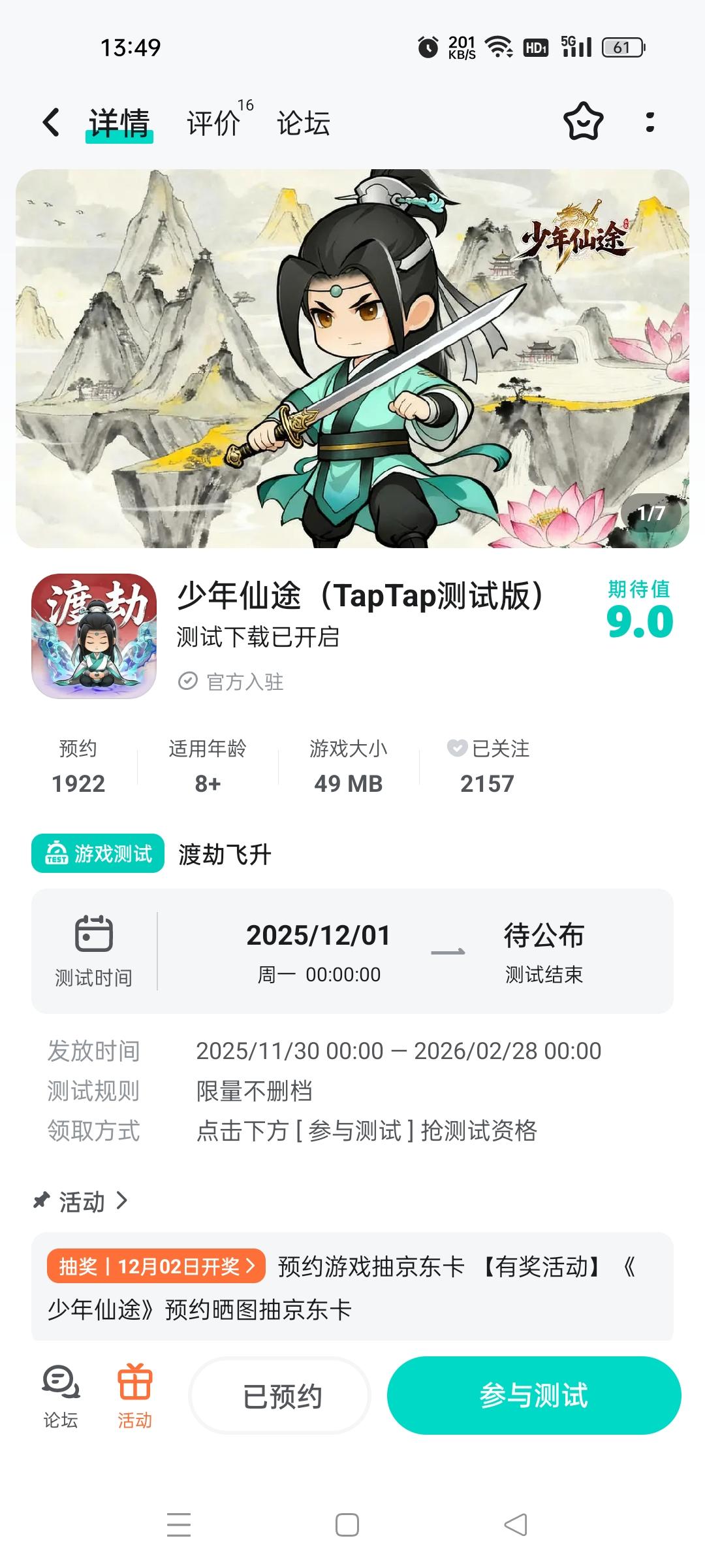 【有奖活动】《少年仙途》开测晒图抽京东卡