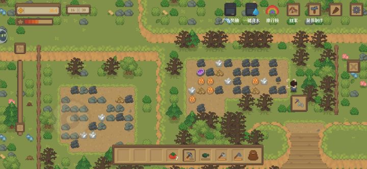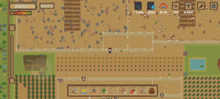 首先这款横屏游戏有点费时间,时间不多的不建议工具栏一个是开垦荒地,一个伐木一个挖矿,前期不要乱用(不想看广告的话),因为有耐久,其次背包有容量限制,只需要开垦空出十几块地种菜就行了,池塘可以补水。点击工具界面右边会有操作界面,如果要切换NPC对话需要关掉,农场右边是小镇,任务NPC对话去店里找NPC,小镇下面有渔场。小镇入口进去有2列地,商店后有1排地,这3块地,不需要浇水,不需要浇水,不需要
