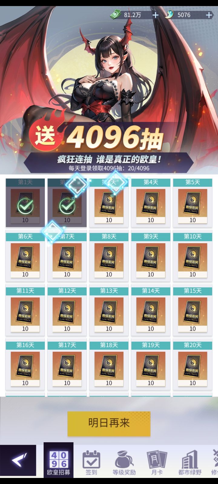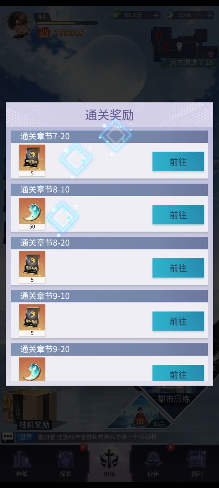 怎么说一天玩下来,还是比较好的,画面精美,战斗可以切出来,不用在里面傻傻的等着,回合制放置游戏的通病就是要么搞个跳过,要么像这样可以切出,不然在里面傻傻的等,很劝退人的人的,游戏福利还是相当好的,基本白嫖可以玩下去,里面也不怎么卡境界,基本白嫖就可以达成,没有说硬要充值才能进阶或者过关的关卡,唯一让我不理解的是为什么高级抽取里面没有神话的保底机制,全靠几率抽取,如果能搞个神话保底机制可能会好点,还是期待正式上线吧,现在只是测试阶段,还有很大的修改空间的,