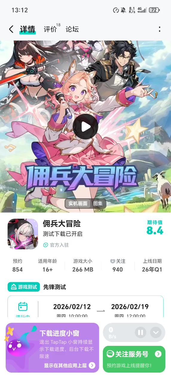 实测爽感拉满!二次元割草停不下来~《佣兵大冒险》首测即将于2月12日10:00开启!勇者们快来查收本次测试的攻略吧!【先锋测试情报】测试时间:2026年2月12日10:00~2月19日12:00测试性质:限时开放、计费、删档测试测试平台:TapTap安卓端【测试相关】Q:如何参与「先锋测试」?A:2026年2月12日10:00在TapTap搜索《佣兵大冒险》即可下载,名额有限,先到先