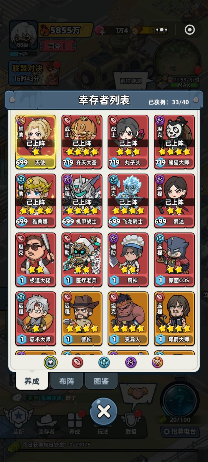 兑换码:0202SYQD有效期:2026年2月09日兑换码:一夜春风来兑换码:版本盛启兑换码:我们是未来兑换码:V-so-风叶沐沐-洄44获取内容:90000钻石T0 天花板阵容(全阶段通吃)异能爆发流(零氪 / 首充可玩)阵容:机甲战士(主 C)+ 熊猫大师(坦)+ 爱达(增伤)+ 忍术大师(减疗)+ 厨神(奶)+ 齐天大圣(副 C / 坦)核心羁绊:4 异能 + 2 肉盾#生存33天
