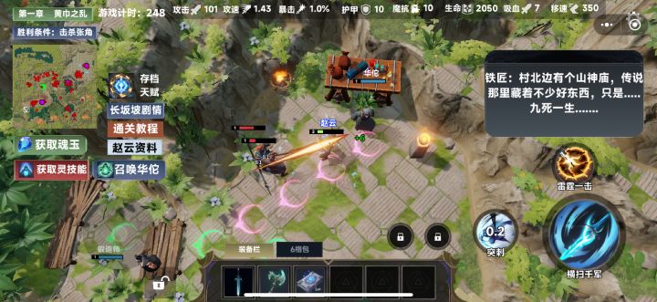 《黄巾之乱攻略》前期正常刷,沿着红色地标走,打败张梁救了华佗之后这样玩: 1、一定要做营救公主任务掉落神级道具 (南蛮藤甲,有了它才能忙抗伤)2、山神庙奇遇选扫尘(加魔抗)3、先去右侧刷到渴血刀再挑战张宝 (超级吸血装备)4、打张角算好他的技能CD,躲好技能就能大打过(拿到南蛮藤甲,渴血刀)