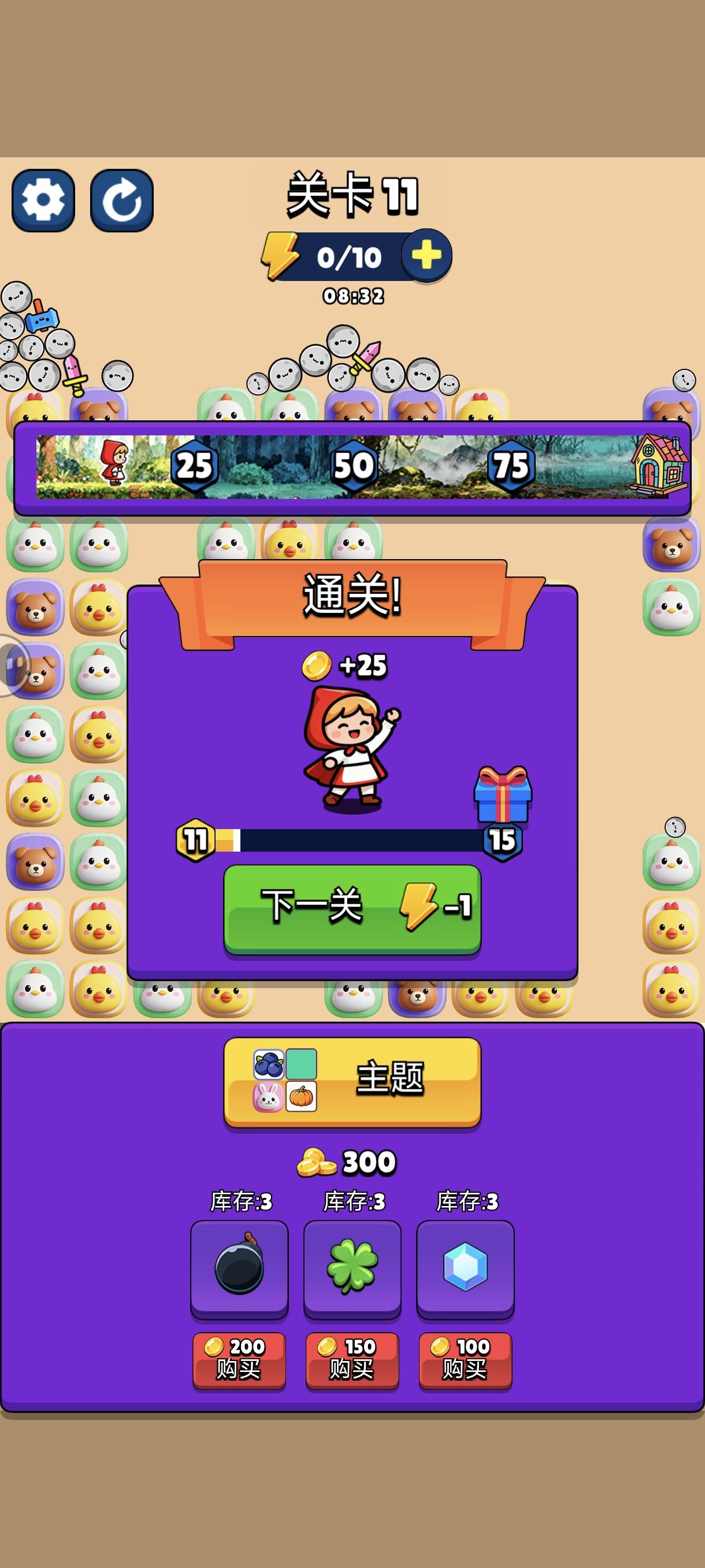 以关卡制进行游戏,同很多小游戏一样有体力机制,没体力要看广告恢复,或等自然时间恢复。单关大约几分钟即可通关,主要看消除策略,有可能一个疏忽就得重新来过。