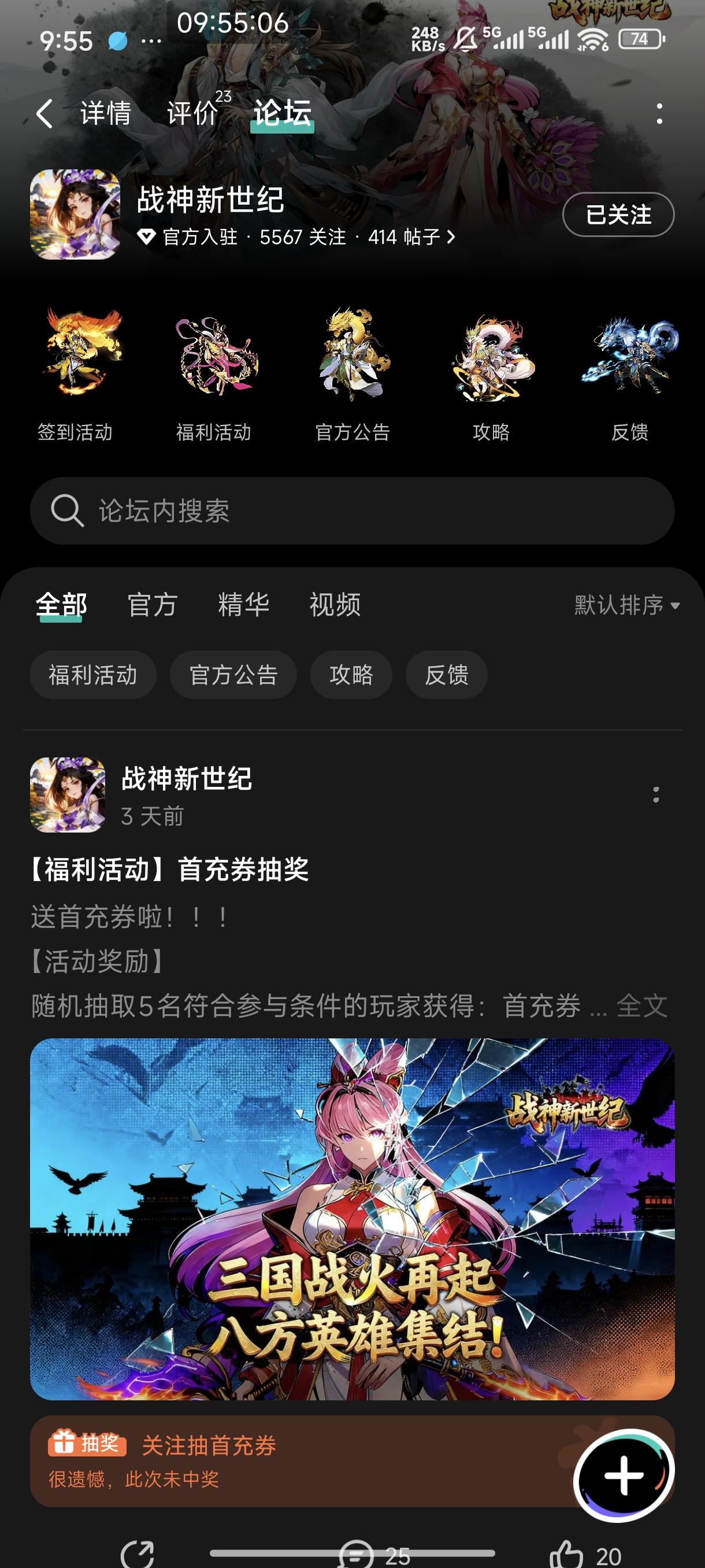 送首充券啦!!!【活动奖励】随机抽取5名符合参与条件的玩家获得:首充券*1【参与方式】点击关注游戏测试并回复本帖即可【活动时间】即日起至12月12日【活动规则】1.内容禁止涉及暴力、色情、政治、恐怖内容,违者做删帖处理并取消活动资格;2.回复内容需与活动主题相关,若抽中楼层与主题无关则将取消领奖资格;3.请勿盗用他人回复内容,否则取消抽奖资格;4.每个IP仅有一次中奖机会,严