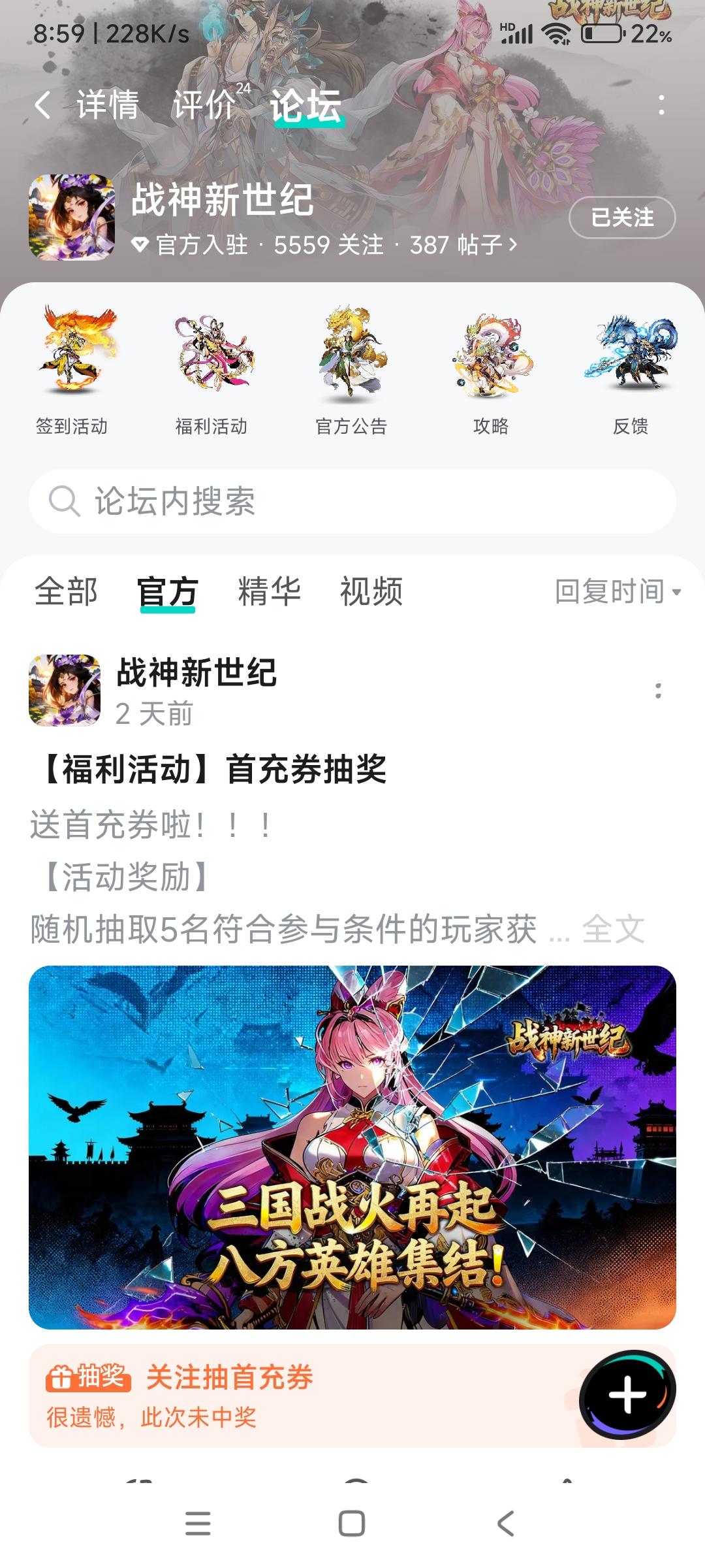 送首充券啦!!!【活动奖励】随机抽取5名符合参与条件的玩家获得:首充券*1【参与方式】点击关注游戏测试并回复本帖即可【活动时间】即日起至12月12日【活动规则】1.内容禁止涉及暴力、色情、政治、恐怖内容,违者做删帖处理并取消活动资格;2.回复内容需与活动主题相关,若抽中楼层与主题无关则将取消领奖资格;3.请勿盗用他人回复内容,否则取消抽奖资格;4.每个IP仅有一次中奖机会,严