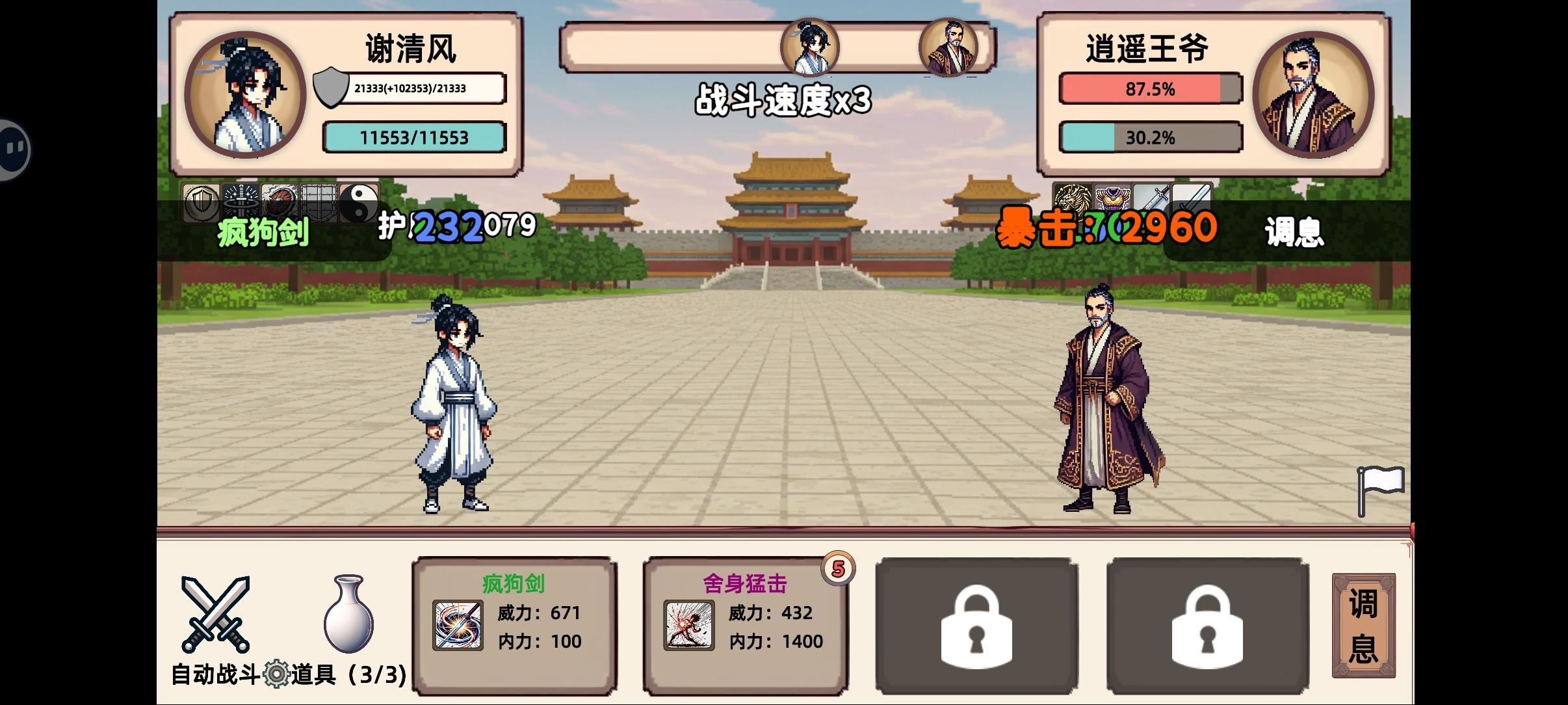 第二把就找到一个轮椅,治疗+血上限,回合结束剑意+7伤害,2000内力换10剑意的招式,无限调息就可以只要扛得住,boss战300多层剑意