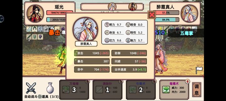 宝物:选玄机策(谋划给经验那个)最好用,没有的话就选永久加成类的,毒系没办法在几回合之内分出胜负。