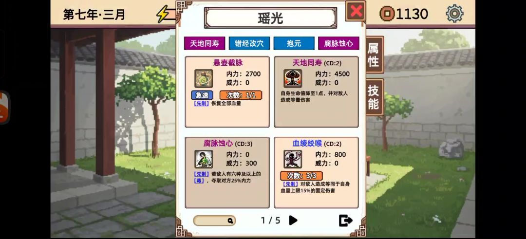 #新手攻略 道具选择百宝袋(增加道具伤害) 打完木头人选择增加内力和血量的天赋学习,学完以后会送一个防御技能,这个也是关键后面扛BOSS伤害用 偶遇事件优先选择防御,命中,血量 每年的体力用来学武功,优先学品质高的,传功阁遇到加修炼多给经验的一定要拿,然后自由天赋点 升级选择天赋优先级如下 境界升级天赋>鬼怪手(增加暗器伤害)>血量>防御>命中>出手>加根骨加悟性加身法>随机策略 按