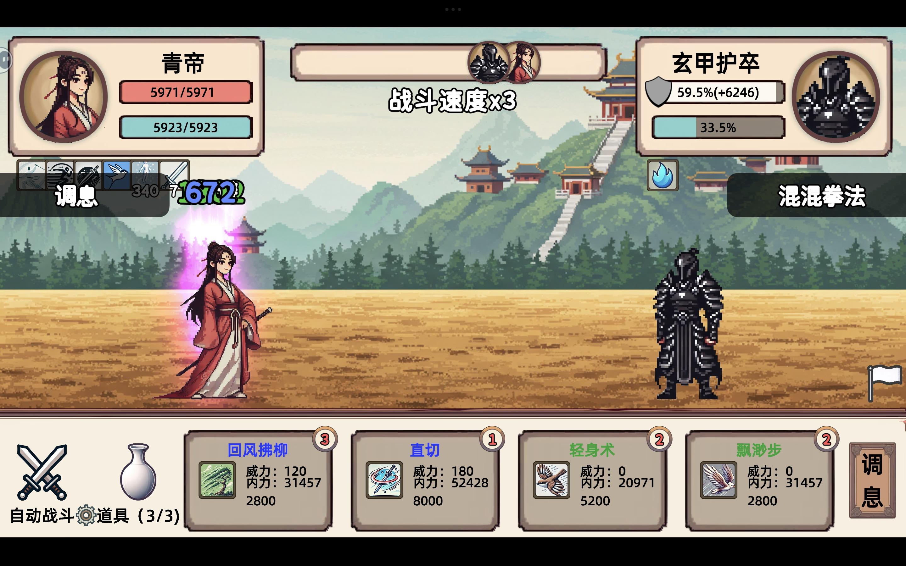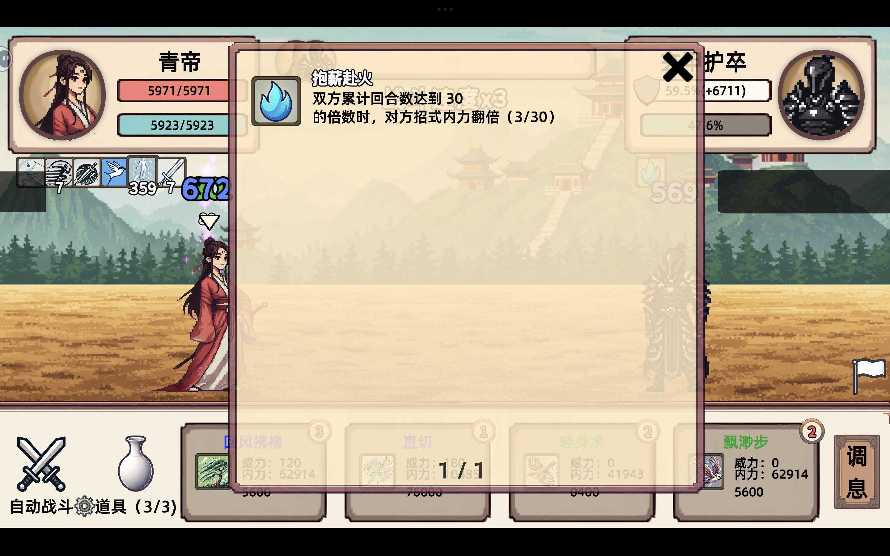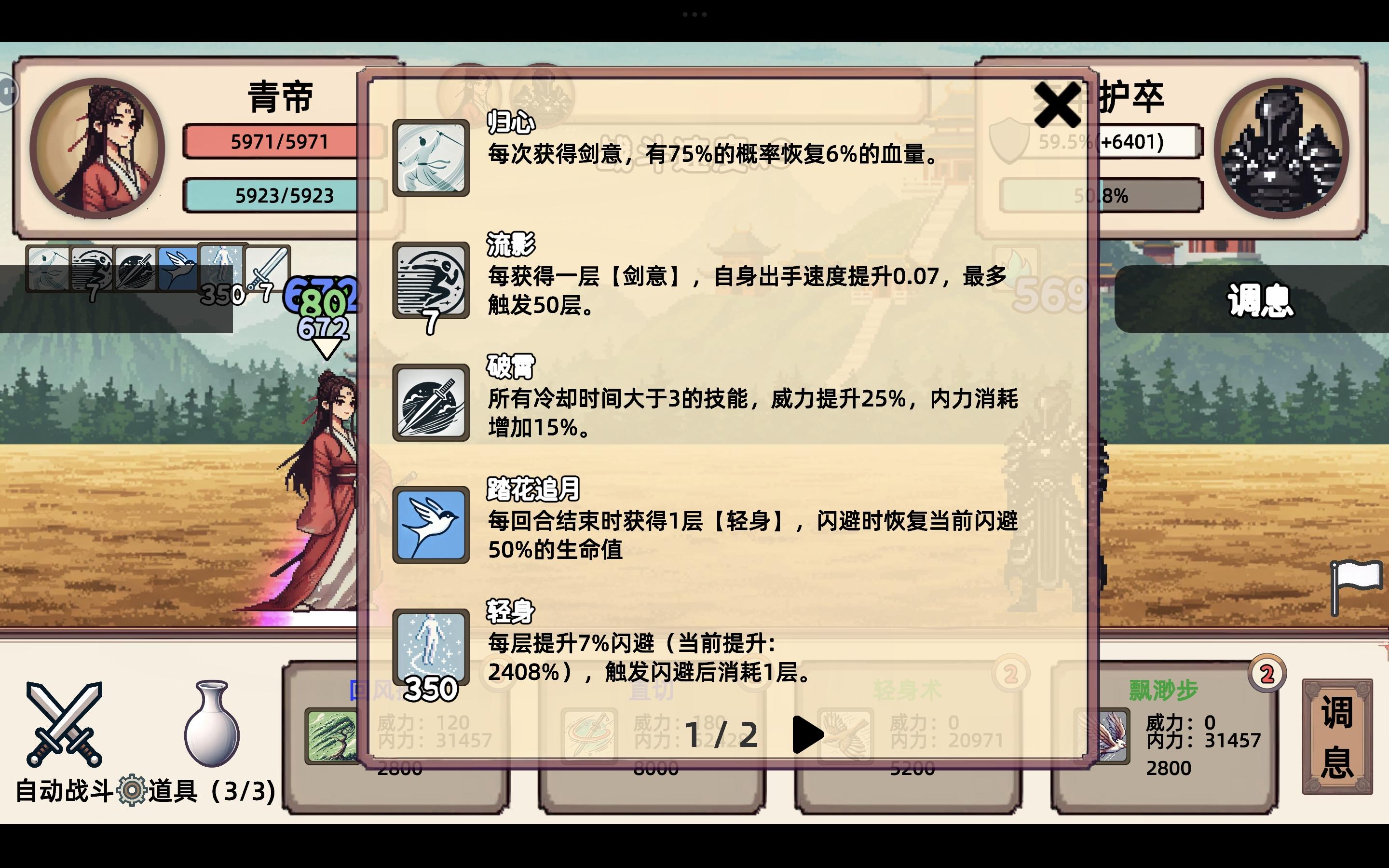 二流已经可以越级无损打最终boss了,介意多做点交互,现在感觉就是一个人孤独的练武,可以做做门派的交互,比如职位的更多玩法,和师兄弟互动竞争,各个门派之间的攻伐,加强门派存在感,晋升难度节奏再继续加长加大,不然通关太快不耐玩功法数值还是有问题,介意重新做一下数值,并且藏书阁的品质也比较随机,最好是什么身份只能刷出什么颜色的功法,并且功法途径可以多一点,比如什么门派大比第一名给功法副职感觉用处不