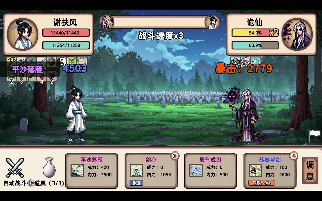 诡仙的小冷门打法,核心利用平沙秋雁打60%进度条。这剧本这样打挺有意思的,有每回合回复40%蓝的被动,打其他小怪时候把平沙换成一闪,连环炮猛的一批(常规剧本修崖也可以这样玩,比穿云更猛)。关于速度,诡仙是4.2速,两种打法,一个是用剑气叠高速度,加上剑心的加速 很稳。另一种是钓鱼(这剧本技艺好提升)有个受伤加进度条20%的,注意自己受毒伤也加,所以这也是下毒流核心计策,我是奔着玩毒师玩的根据来卡选