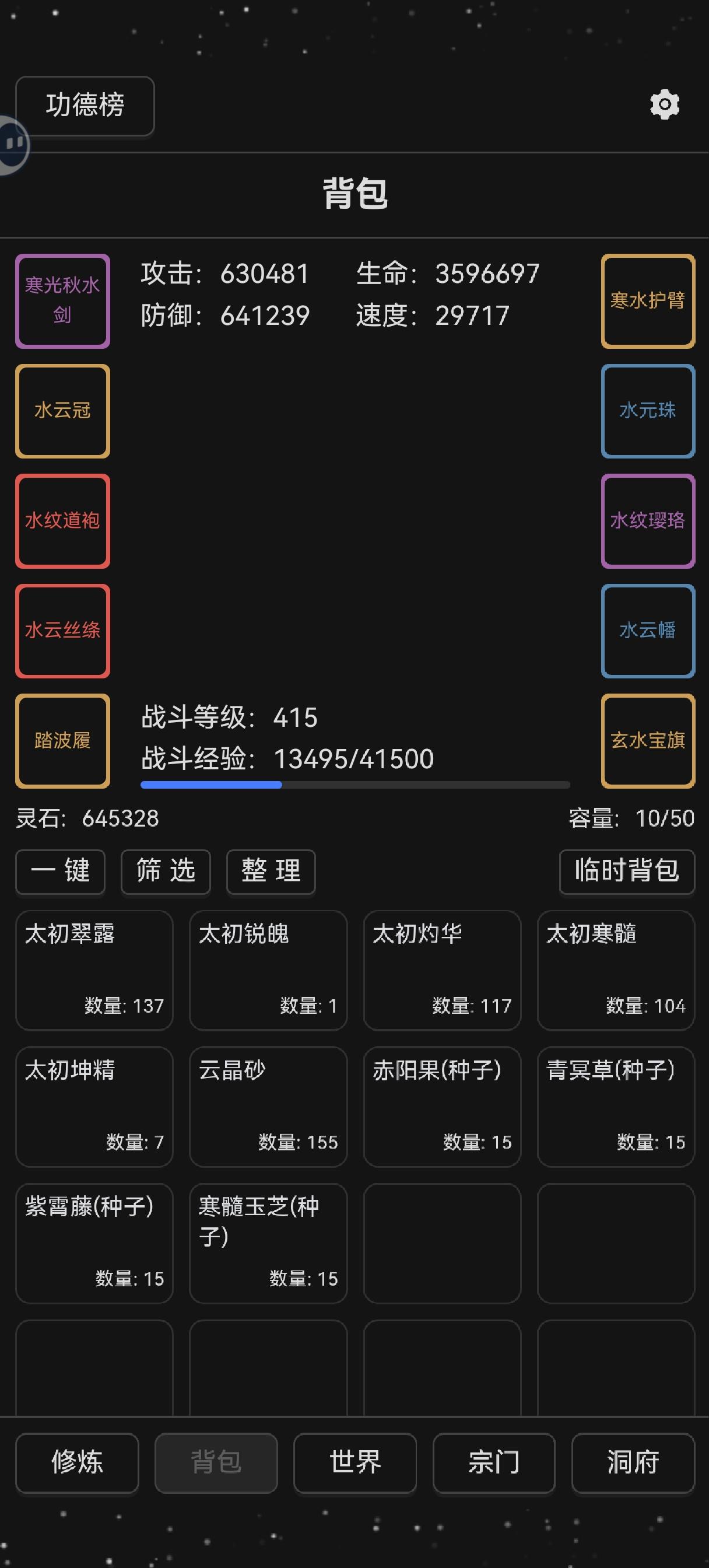 水木灵根提升到13级了,丹炉也升至满级,重新挂回灵根地图。修为提升很快,一天时间涨了两个小境界。宗门升到长老,预计明天就能换满东西回桃花宗。后面就是较为漫长的种田炼丹刷灵根了。目前计划刷到15级灵根(预计要四天),以最快速度获得十方装备以便升级。境界到真仙后刷怪就不会有什么阻碍了