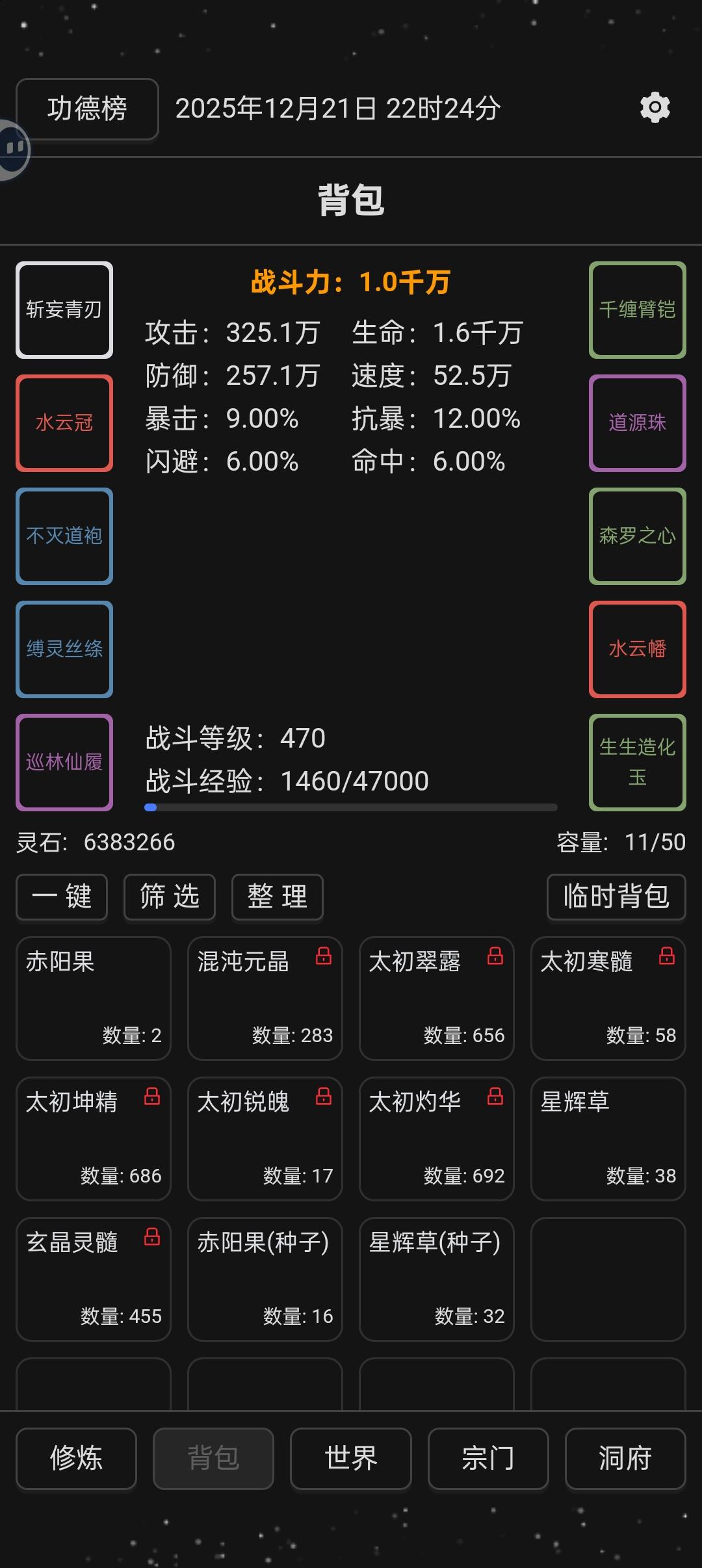 因为一开始只点了金灵根,后面需要木灵根炼长春功,果断回档重练。(灵根平均分配,这下没法被制裁了吧)然后发现后续更新可以直接刷地图的木灵根材料……白回档了。但之前的档并没有记录下来,所以只能重练了。不过有更新的关系,升级速度还是快不少的,从一周天10经验升到了1560,6小时就化境了。