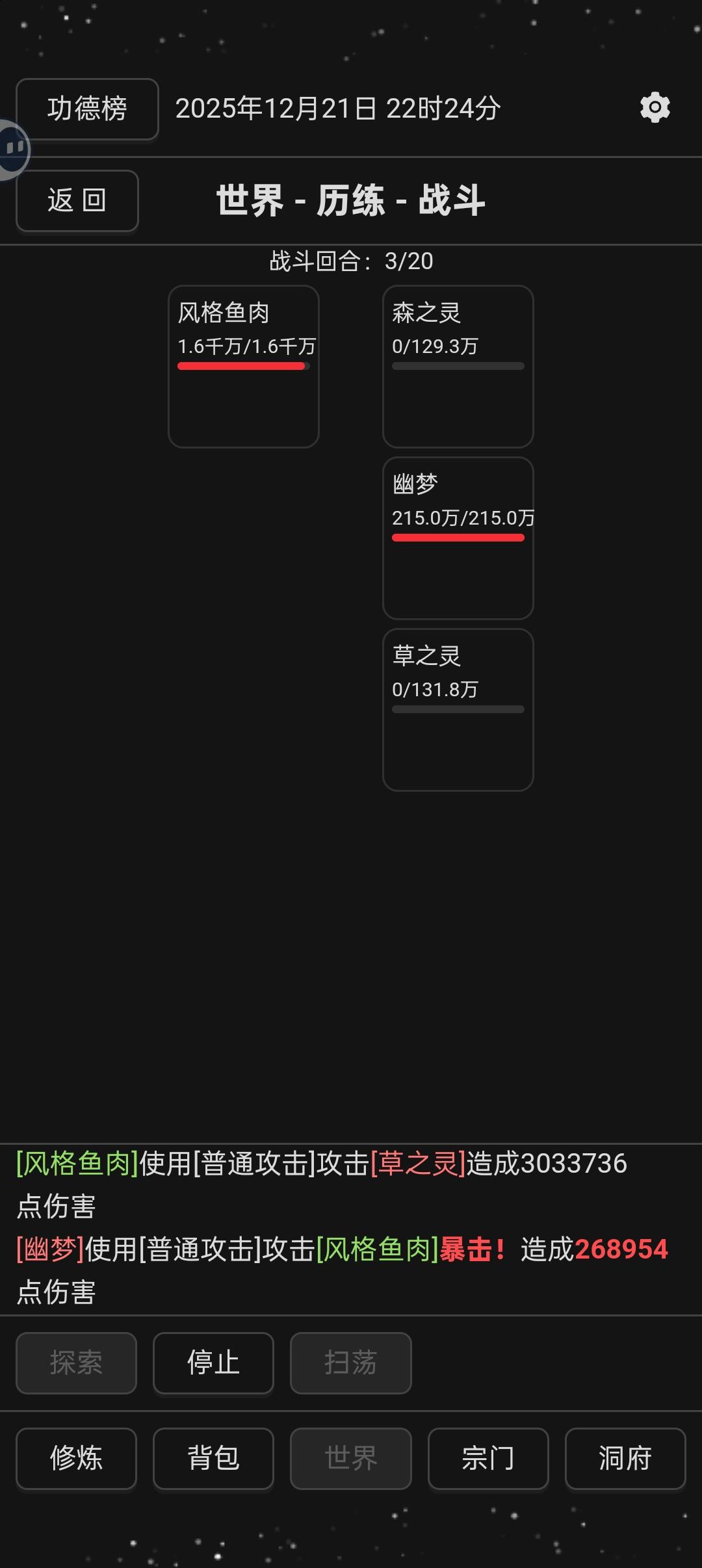 自本次更新之后怪物大变样,比如这个幽梦超高的闪避率使我有些破防,我的攻击力可以一巴掌拍死但就是打不到,以前的装备也需要重新刷了,幸好战斗等级的加成还在不然咱怕是连同级小怪都干不过了。 战斗经验大幅减少使的战斗等级提升更慢了,也不知道咱的百战不殆下一次升级要啥时候。 秘境怪物的战斗力倒是不强(对我来说),主要是没有闪避率超高的阴间怪,灵根秘境提供的大量灵根升级材料使我看到灵根满级的希望。 百战