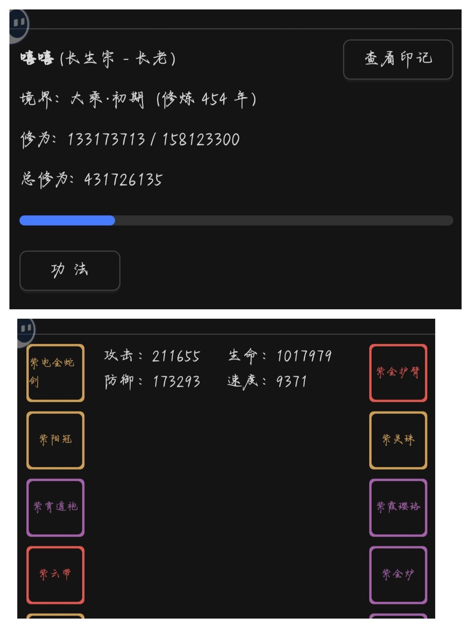 水木灵根提升到13级了,丹炉也升至满级,重新挂回灵根地图。修为提升很快,一天时间涨了两个小境界。宗门升到长老,预计明天就能换满东西回桃花宗。后面就是较为漫长的种田炼丹刷灵根了。目前计划刷到15级灵根(预计要四天),以最快速度获得十方装备以便升级。境界到真仙后刷怪就不会有什么阻碍了