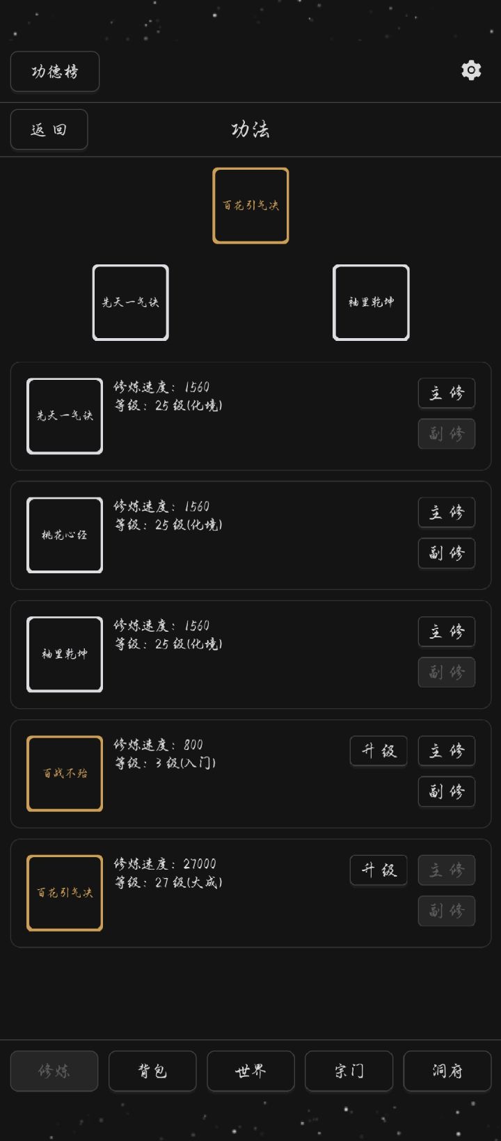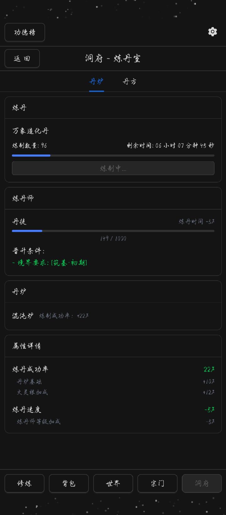 水木灵根提升到13级了,丹炉也升至满级,重新挂回灵根地图。修为提升很快,一天时间涨了两个小境界。宗门升到长老,预计明天就能换满东西回桃花宗。后面就是较为漫长的种田炼丹刷灵根了。目前计划刷到15级灵根(预计要四天),以最快速度获得十方装备以便升级。境界到真仙后刷怪就不会有什么阻碍了