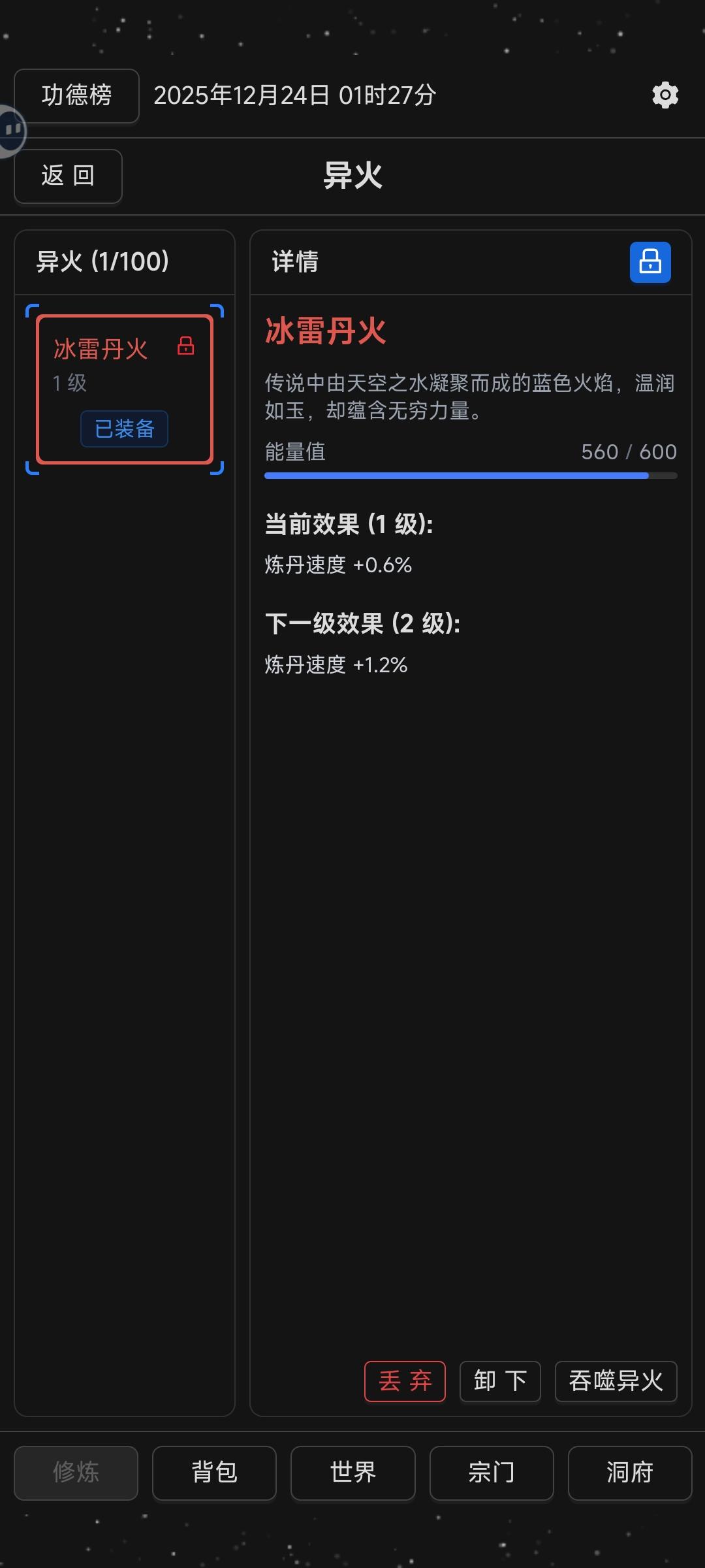 因为一开始只点了金灵根,后面需要木灵根炼长春功,果断回档重练。(灵根平均分配,这下没法被制裁了吧)然后发现后续更新可以直接刷地图的木灵根材料……白回档了。但之前的档并没有记录下来,所以只能重练了。不过有更新的关系,升级速度还是快不少的,从一周天10经验升到了1560,6小时就化境了。
