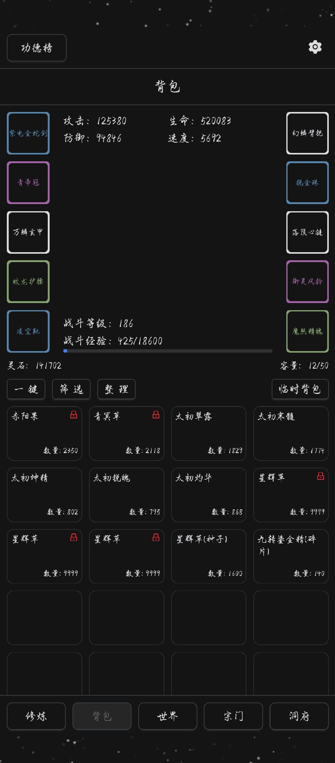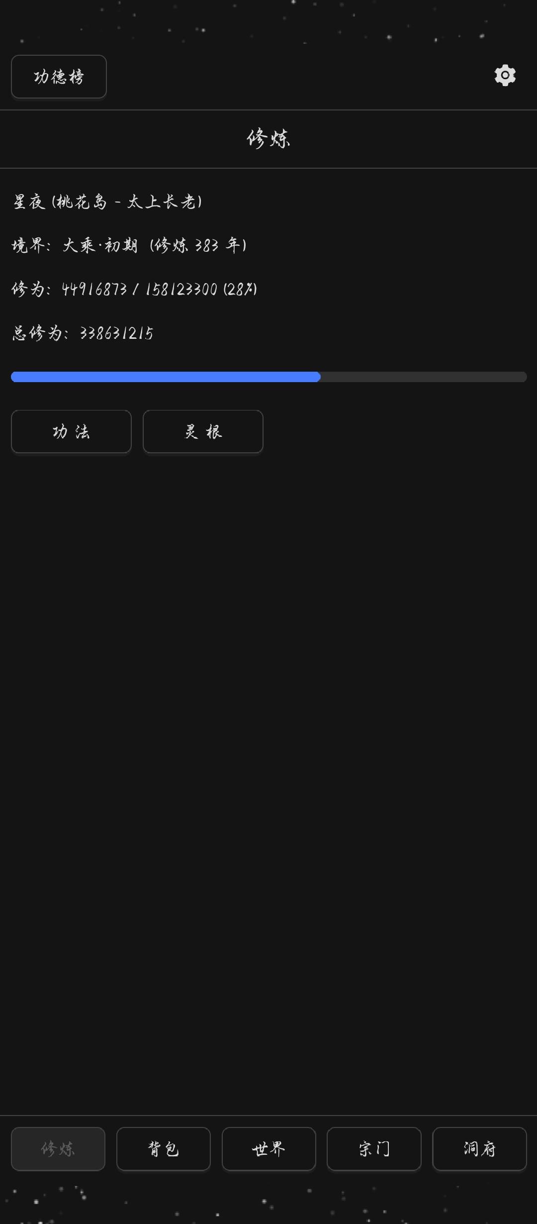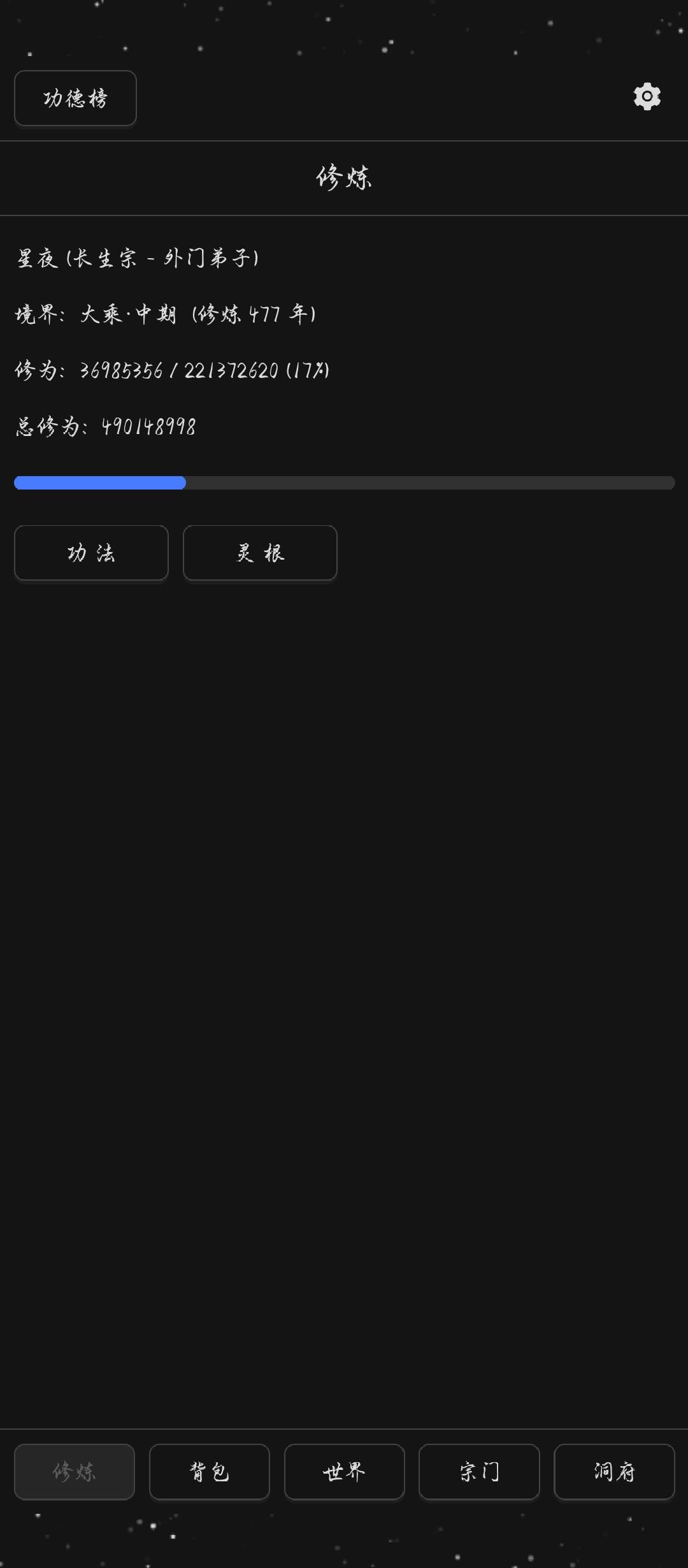 因为一开始只点了金灵根,后面需要木灵根炼长春功,果断回档重练。(灵根平均分配,这下没法被制裁了吧)然后发现后续更新可以直接刷地图的木灵根材料……白回档了。但之前的档并没有记录下来,所以只能重练了。不过有更新的关系,升级速度还是快不少的,从一周天10经验升到了1560,6小时就化境了。