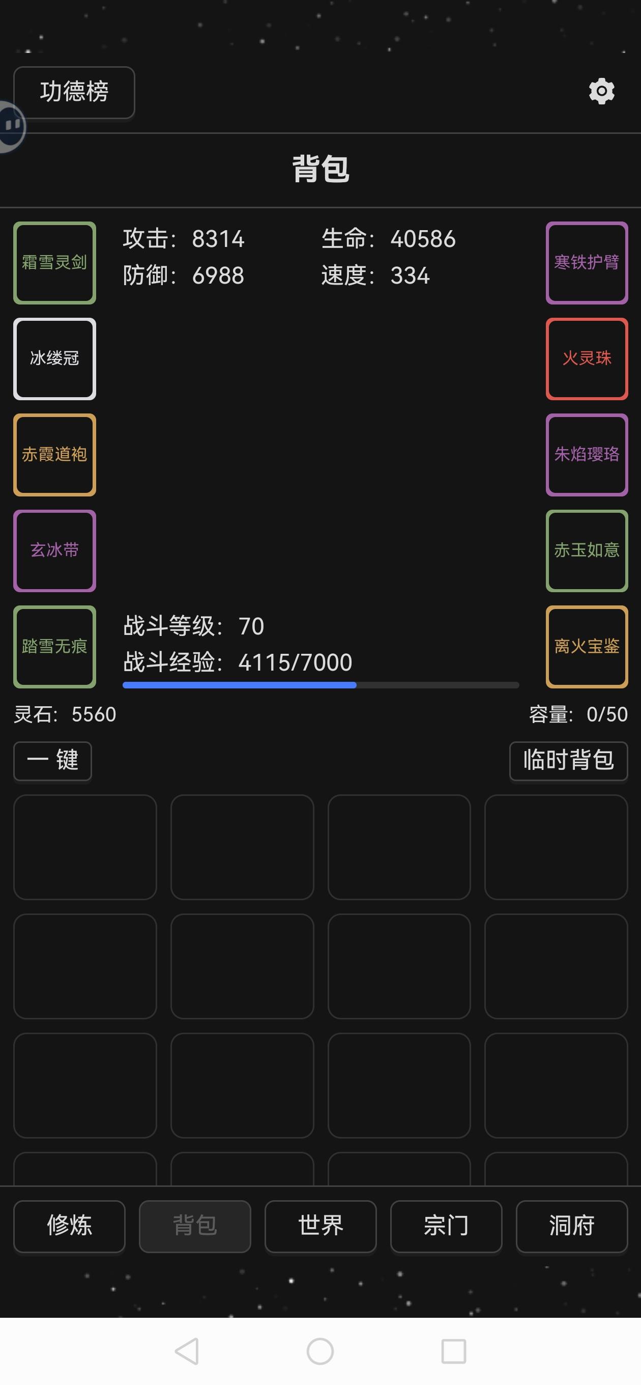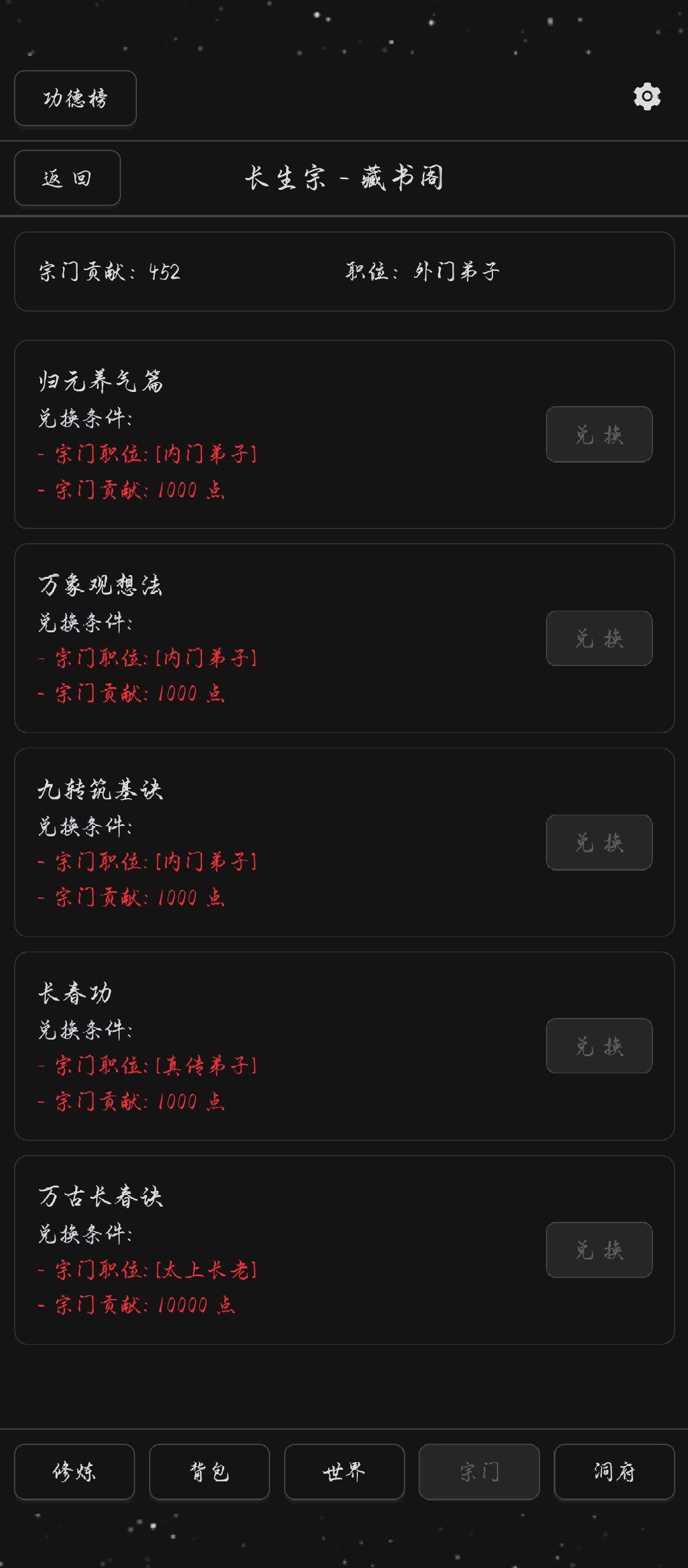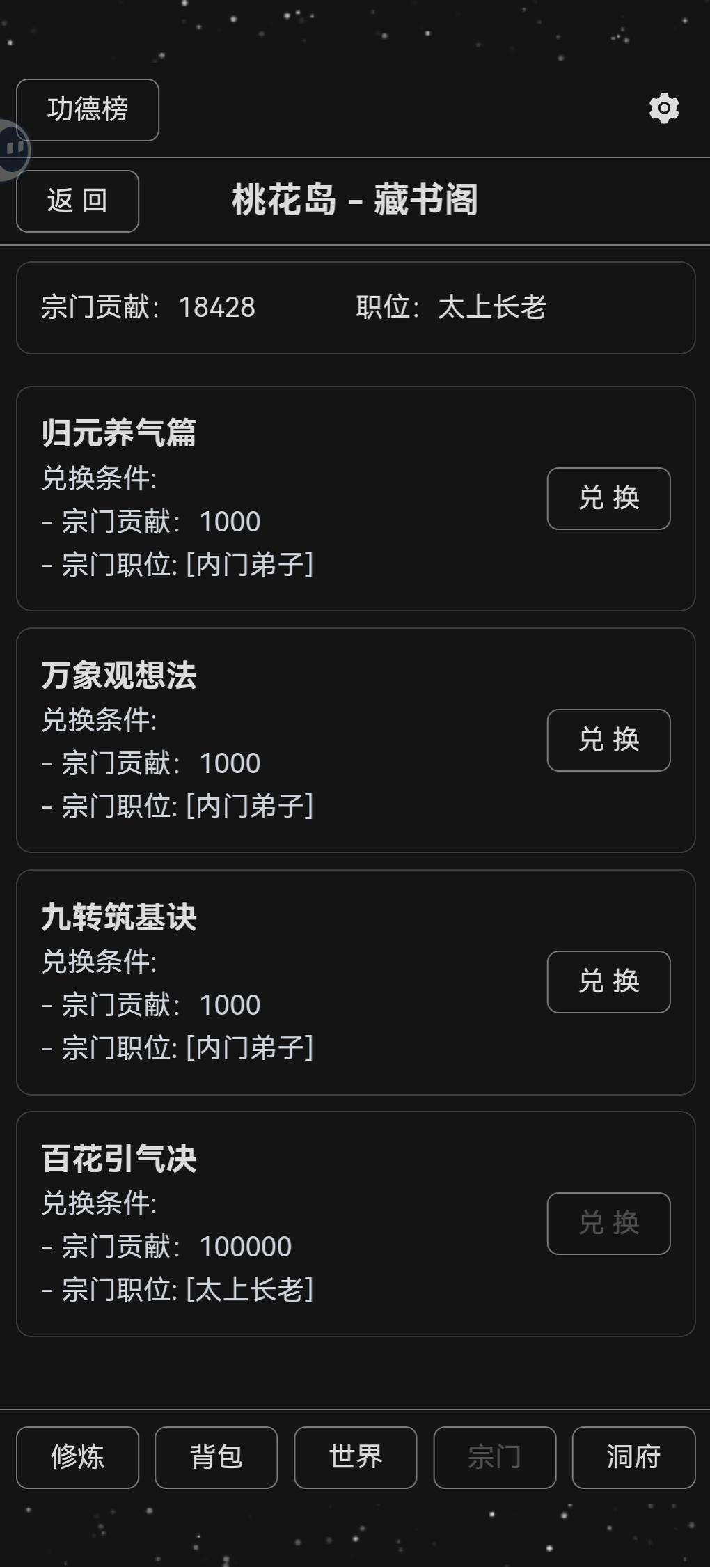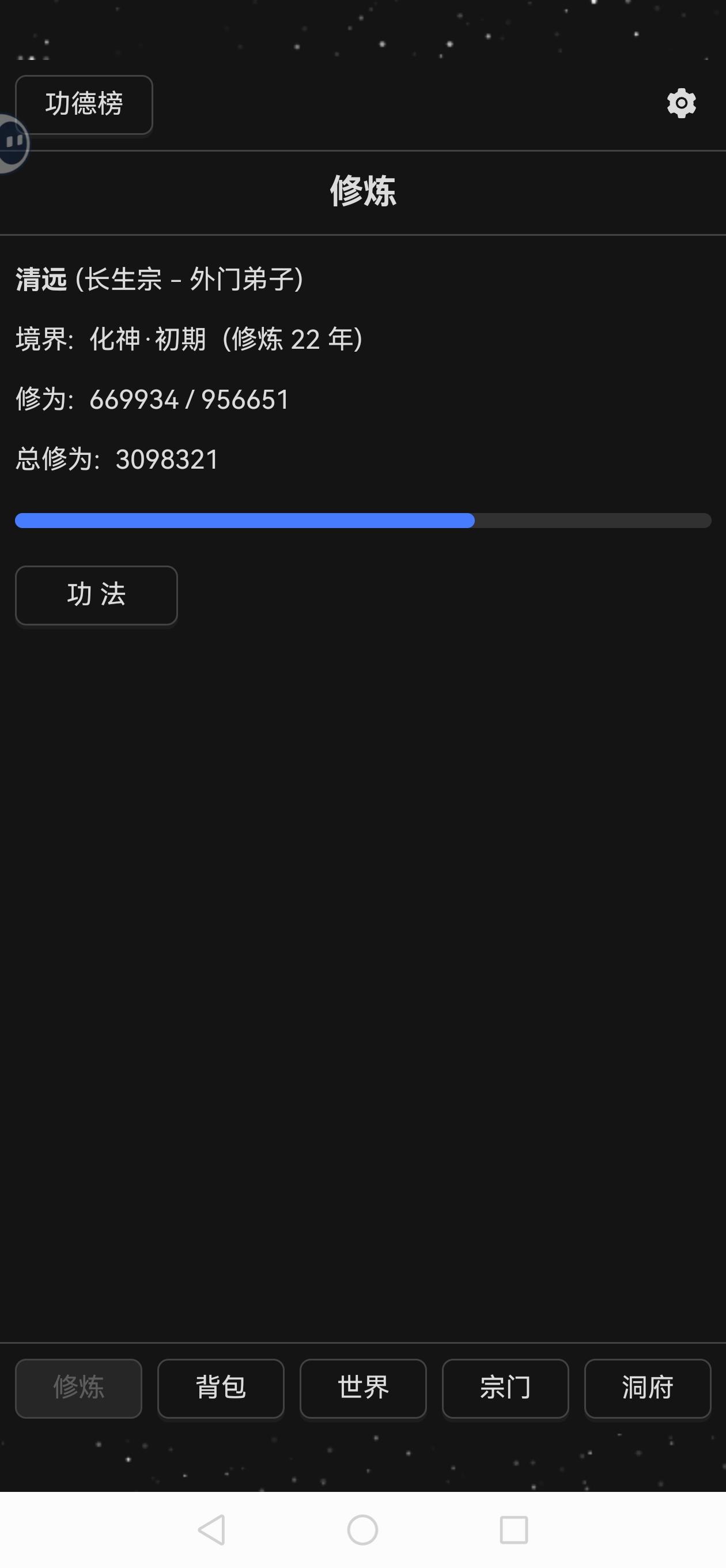 因为一开始只点了金灵根,后面需要木灵根炼长春功,果断回档重练。(灵根平均分配,这下没法被制裁了吧)然后发现后续更新可以直接刷地图的木灵根材料……白回档了。但之前的档并没有记录下来,所以只能重练了。不过有更新的关系,升级速度还是快不少的,从一周天10经验升到了1560,6小时就化境了。