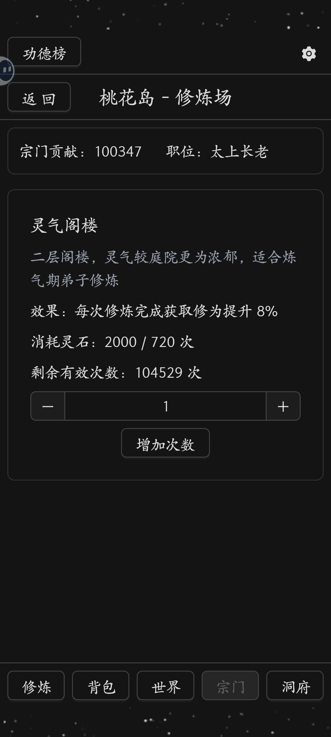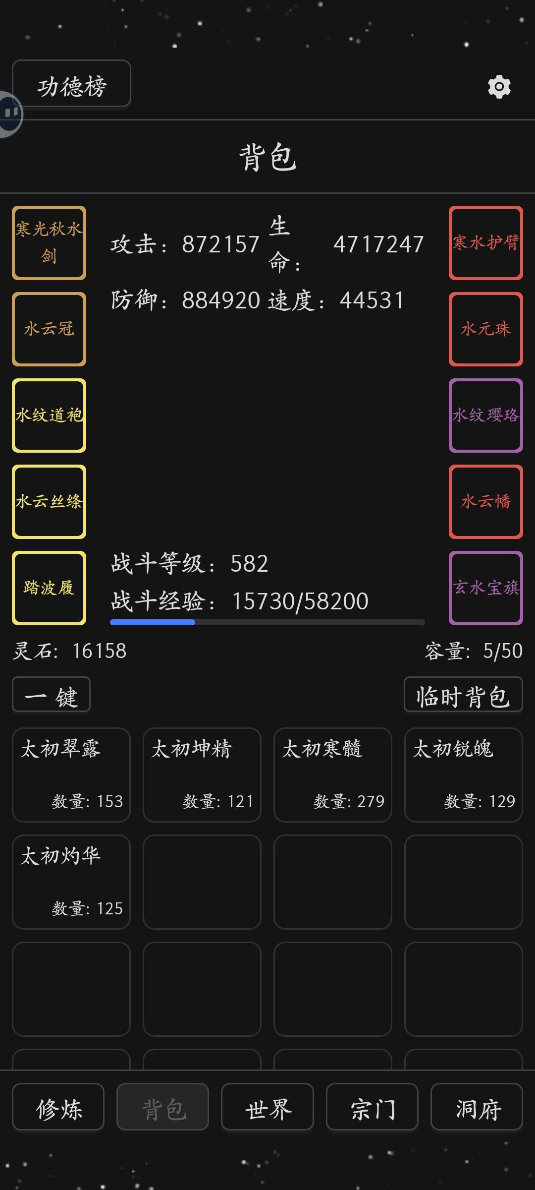 水木灵根提升到13级了,丹炉也升至满级,重新挂回灵根地图。修为提升很快,一天时间涨了两个小境界。宗门升到长老,预计明天就能换满东西回桃花宗。后面就是较为漫长的种田炼丹刷灵根了。目前计划刷到15级灵根(预计要四天),以最快速度获得十方装备以便升级。境界到真仙后刷怪就不会有什么阻碍了