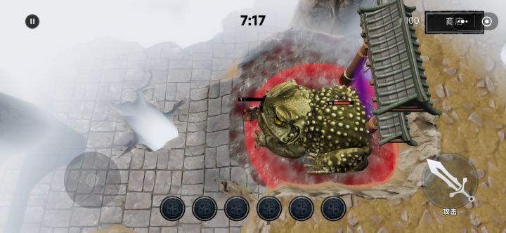 整个游戏就一个关卡,到最后不是打倒蛤蟆,而是让它把自己挤到一个小岛屿上,踩传送阵就算通关了,女忍会追一路,还会击倒攻击,这个看上去像是bug一样的存在,才算有那么点聚光灯的意思。