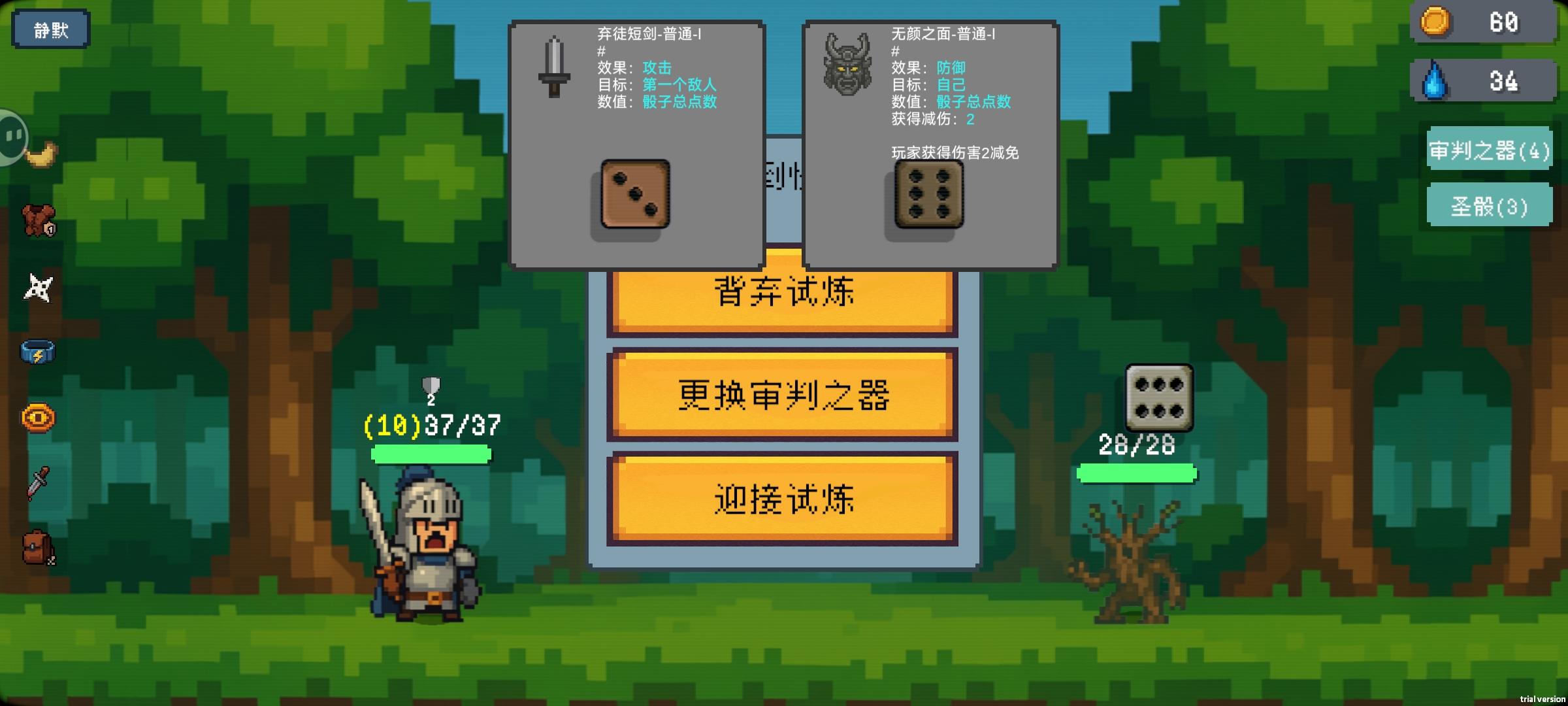 审判之器是装备,圣器是骰子,关卡挑战过程中随事件获得装备或骰子。一味地进攻并不是唯一策略,有的时候还需要防守。