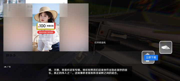 轻度休闲游戏,第一人称视角下代入感很好,猫在开车狗在打盹,他俩还时不时提出一些需求,要玩家来帮忙完成。对话不是经常发生,猫一般情况下开车不说话,气氛显得有些尴尬。