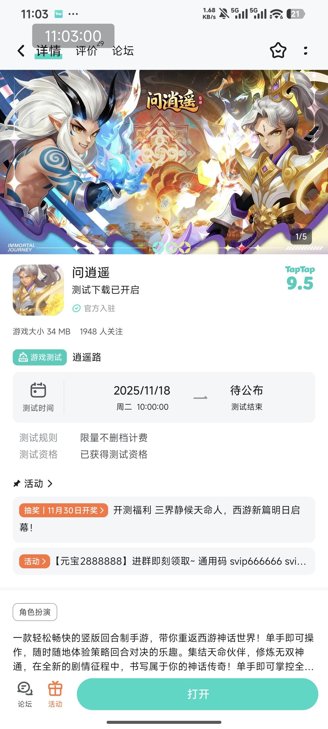竖版回合制手游《问逍遥》邀你重返西游神话世界!单手操作无压力,通勤摸鱼、工作间隙随时开玩,集结天命伙伴、修炼无双神通,全新剧情里书写你的专属传奇~ 三界风云已起,现在入坑还能抱走京东卡福利,速来参与!🎁 活动奖励抽取 1 位幸运仙友,送出 10 元京东卡 1 张(兑换码自动发放,到手就能用~)📝 参与方式点击关注发帖账号 关注游戏在本帖评论区留言,即成功参与⚠️ 活动规则开奖后由 T