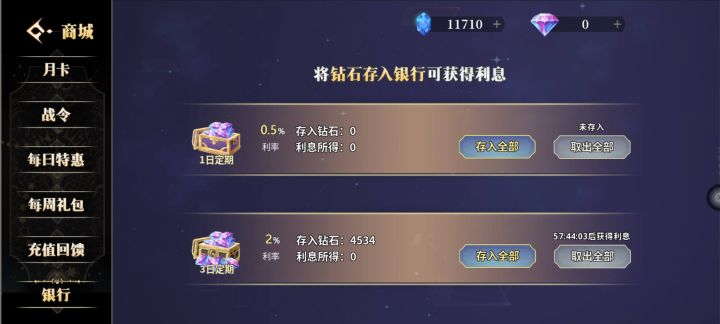 游戏内有一种叫做💎原矿的道具,可以随机开除出1-100的钻石,钻石原矿这种道具每日任务,每周任务,新手任务以及月卡永久卡都可以轻松获得。而游戏内最值得消费的道具无非是永久月卡12800,永久战令9800,单月卡3000这三笔消费,为了方便玩家攒钻石甚至还有银行系统,综合看来这款游戏真是不可多得的好游戏。
