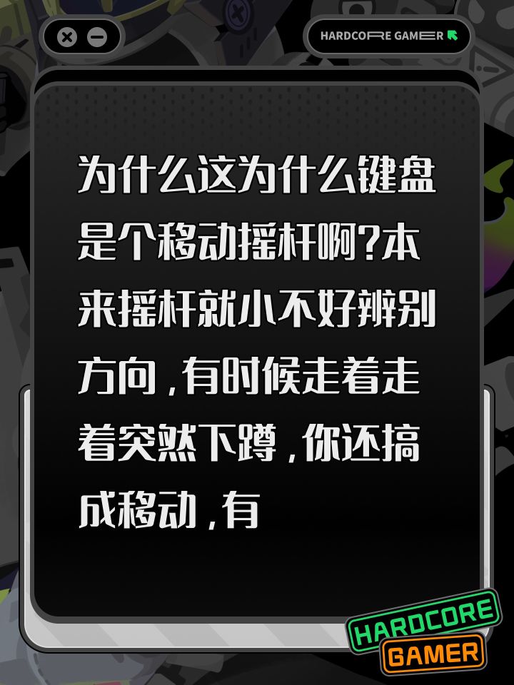 为什么这为什么键盘是个移动摇杆啊?本来摇杆就小不好辨别方向,有时候走着走着突然下蹲,你还搞成移动,有时候误触还能冲向怪。还有就是有时候好好走着,遥感突然消失必须再按一遍,然后就莫名其妙判定下蹲
