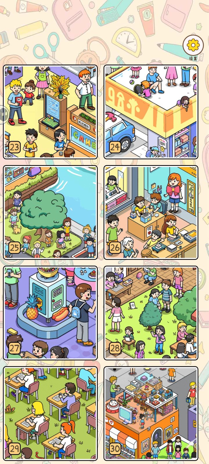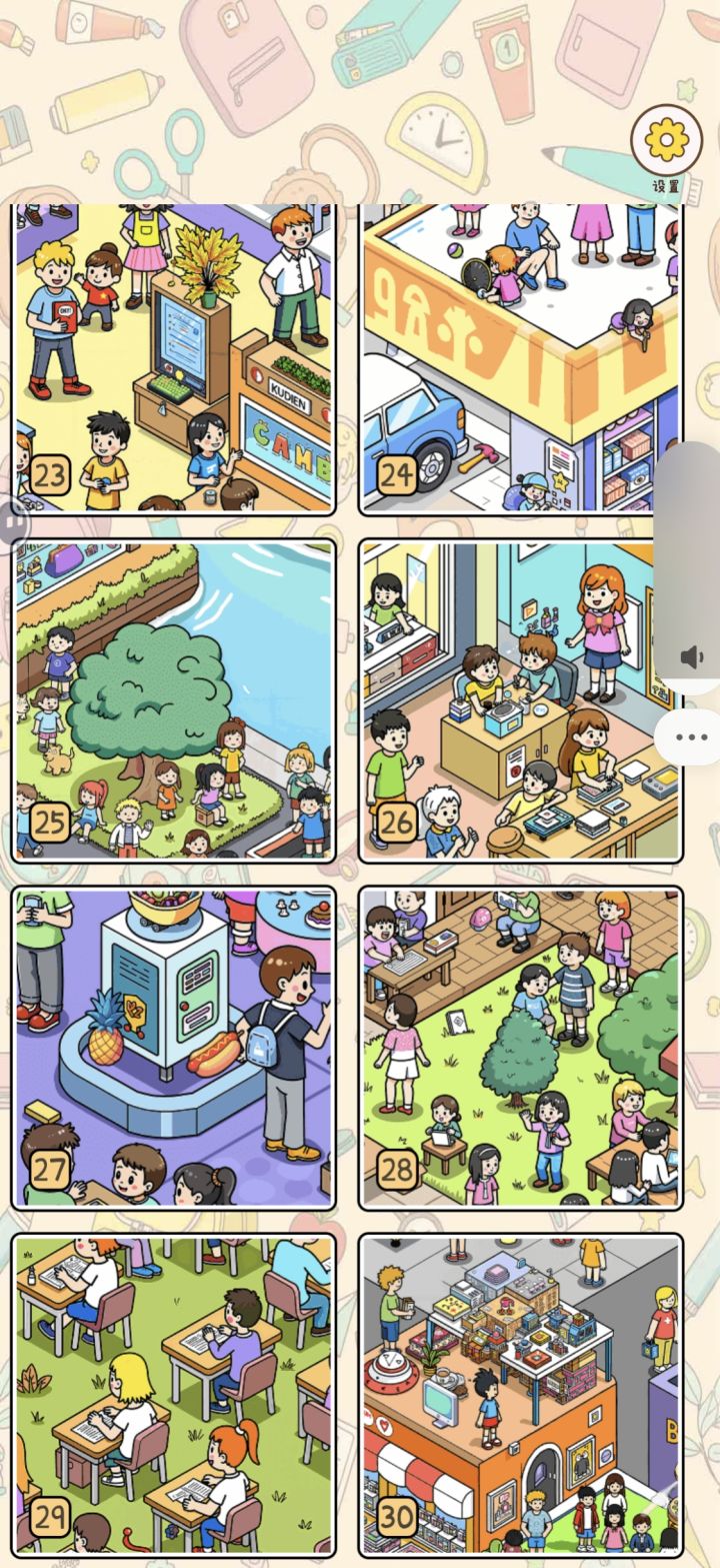 通关打卡,全程没有用提示,主要是不想看视频,所以算下来时常大概每一关六分钟左右,画面算比较清楚,也可以放大缩小,后面熟悉了都开始先盲猜哪个是需要的物品。