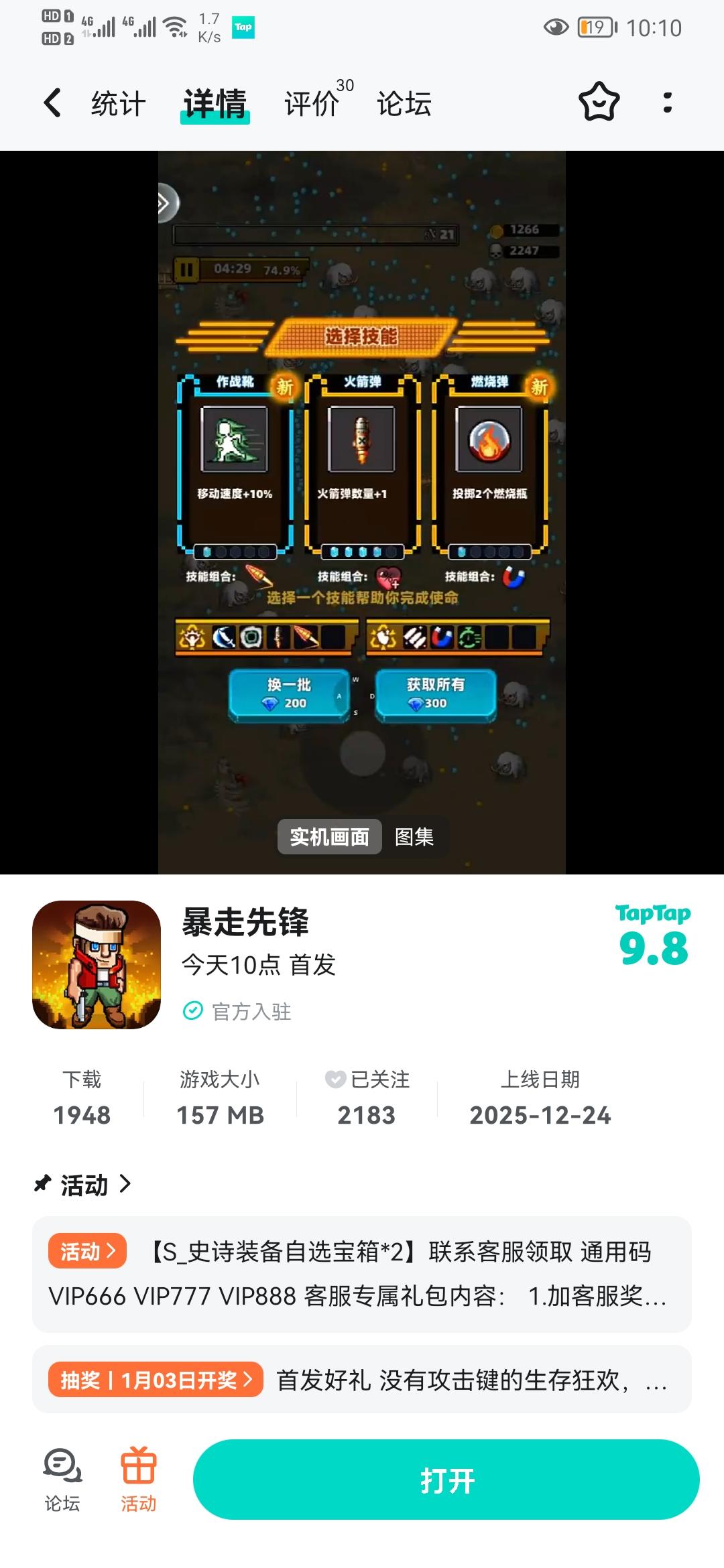 家人们注意啦!期待已久的《暴走先锋》正式首发!为感谢大家的等待,特意准备了首发专属抽奖福利,轻松参与就能赢取好礼,千万别错过!首发时间:2025年12月24日 礼包内容:合成精晶*25,宠物升级材料*4我们将随机抽出10位幸运儿发放我们的礼包码~【参与方式】1.评论区分享游戏内任意截图即可。2.关注游戏和发帖账号【奖品发放】到达开奖时间后,由taptap系统随机抽取符合要求的幸运玩