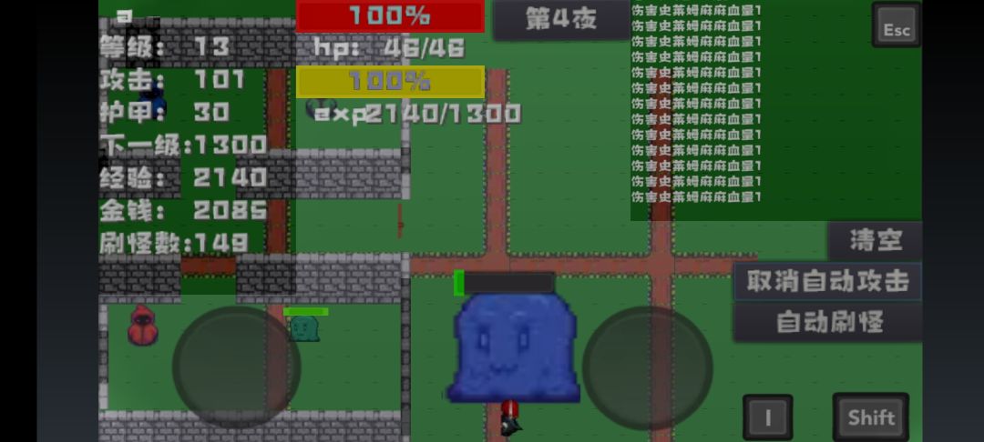 一级3血量,0.5攻击 史莱姆 蓝:攻1 防0 血5 红:攻6 防6 血70 绿:攻30 防20 血230 野 蓝:攻3 防0 血15.5 红:攻3 防15 血210.5 绿:攻3 防50 血690.5 麻麻:攻150 防100 血2000.5 开局直接第一夜,野怪贴脸后攻击方向固定,打不到玩家,可以无伤刷。之后加防无伤刷蓝史莱姆,先买一只再开自动刷怪。不能无伤就加防,不能破甲就加攻,挂机就完事了