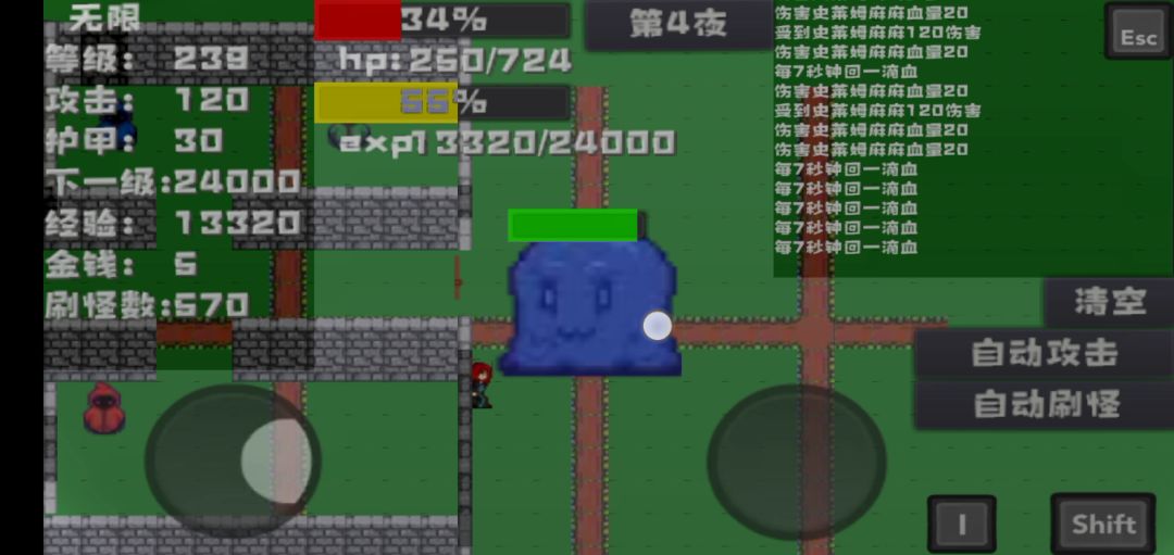 一级3血量,0.5攻击史莱姆蓝:攻1 防0 血5红:攻6 防6 血70绿:攻30 防20 血230野蓝:攻3 防0 血15.5红:攻3 防15 血210.5绿:攻3 防50 血690.5麻麻:攻150 防100 血2000.5开局直接第一夜,野怪贴脸后攻击方向固定,打不到玩家,可以无伤刷。之后加防无伤刷蓝史莱姆,先买一只再开自动刷怪。不能无伤就加防,不能破甲就加攻,挂机就完事了