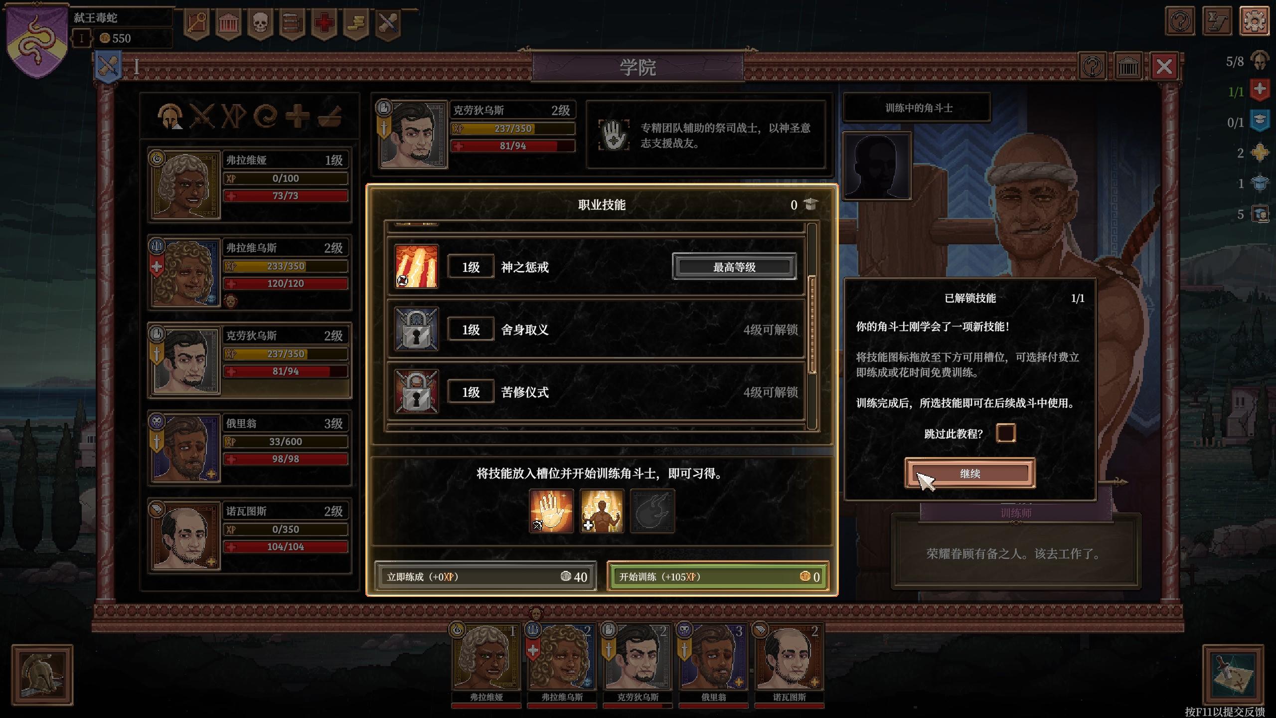 此外获得技能点后要去学院学习,刚点出来的技能不是立刻就能用的,必须经过学习才可以。立刻学习要花金币,慢慢训练需要时长,这个就看玩家自己的选择了。因为战斗中的各种debuff造成的角色负面影响,需要至少两个班底轮流工作才可以保障我们队伍的顺利推进,不能把所有资源都叠在一个人身上,看状态不好就立刻送到医院休息治疗,这样才能长远地让角色变强。当然遇到各项资质都更好的角斗士可以立刻解雇更换。