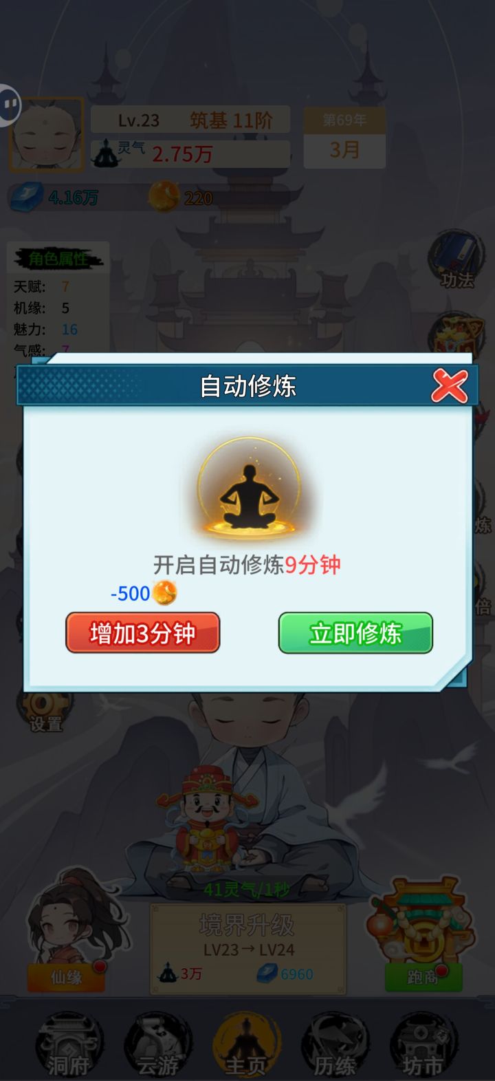 bug很多,还没做好就拿出来了。自动修炼显示9分钟,点开始又只有3分钟。还有广告特别恶心不是跳转就是强制45秒