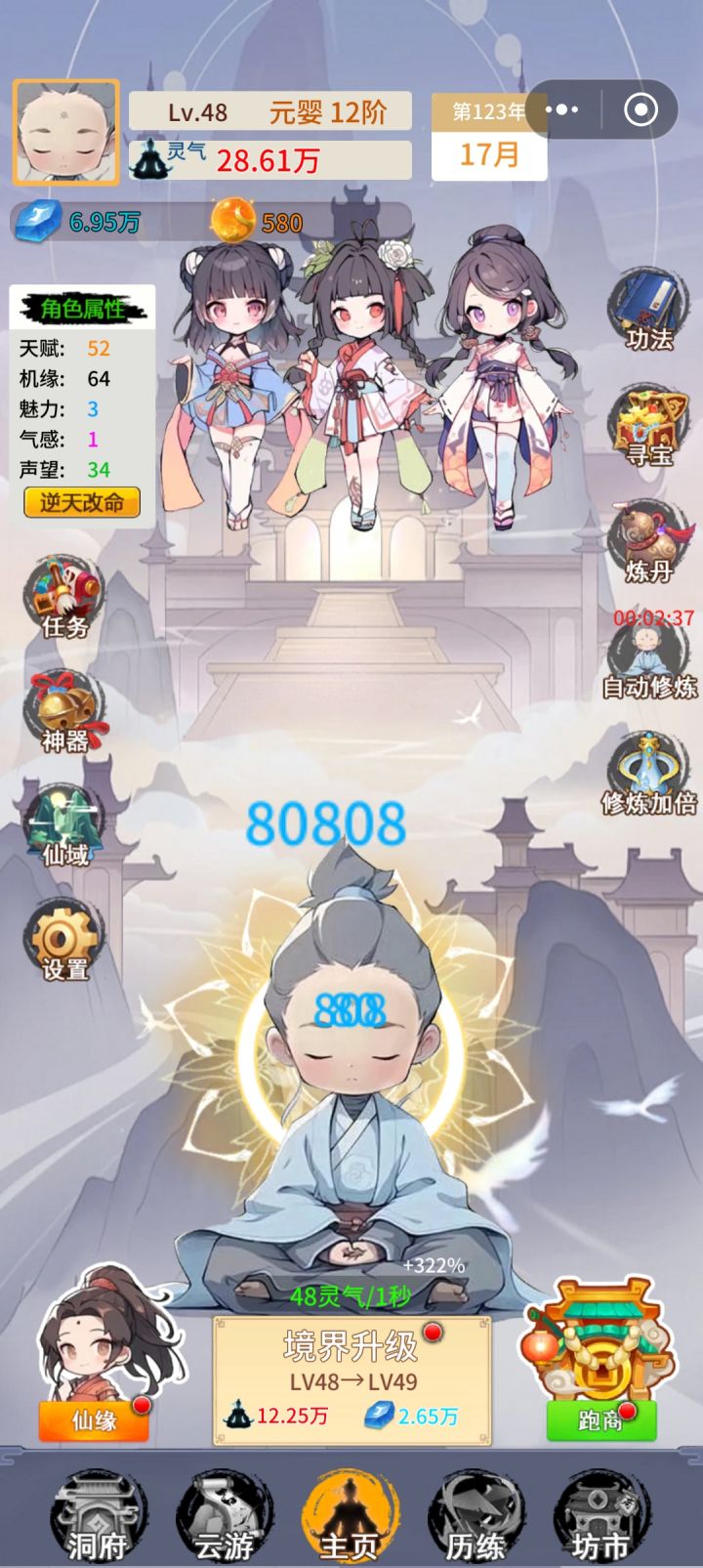 反正就是不看广告你唯一的玩法就是狂点主界面修炼,没了。