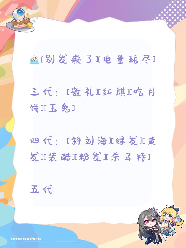 [别发癫了][电量耗尽]三代:[敬礼][红旗][吃月饼][玉兔]四代:[斜刘海][绿发][黄发][装酷][粉发][杀马特]五代:[求好运][超人][小丑][小鬼][雪球]隐藏表情包:[戴口罩][助威][手花][小红花][骷髅]