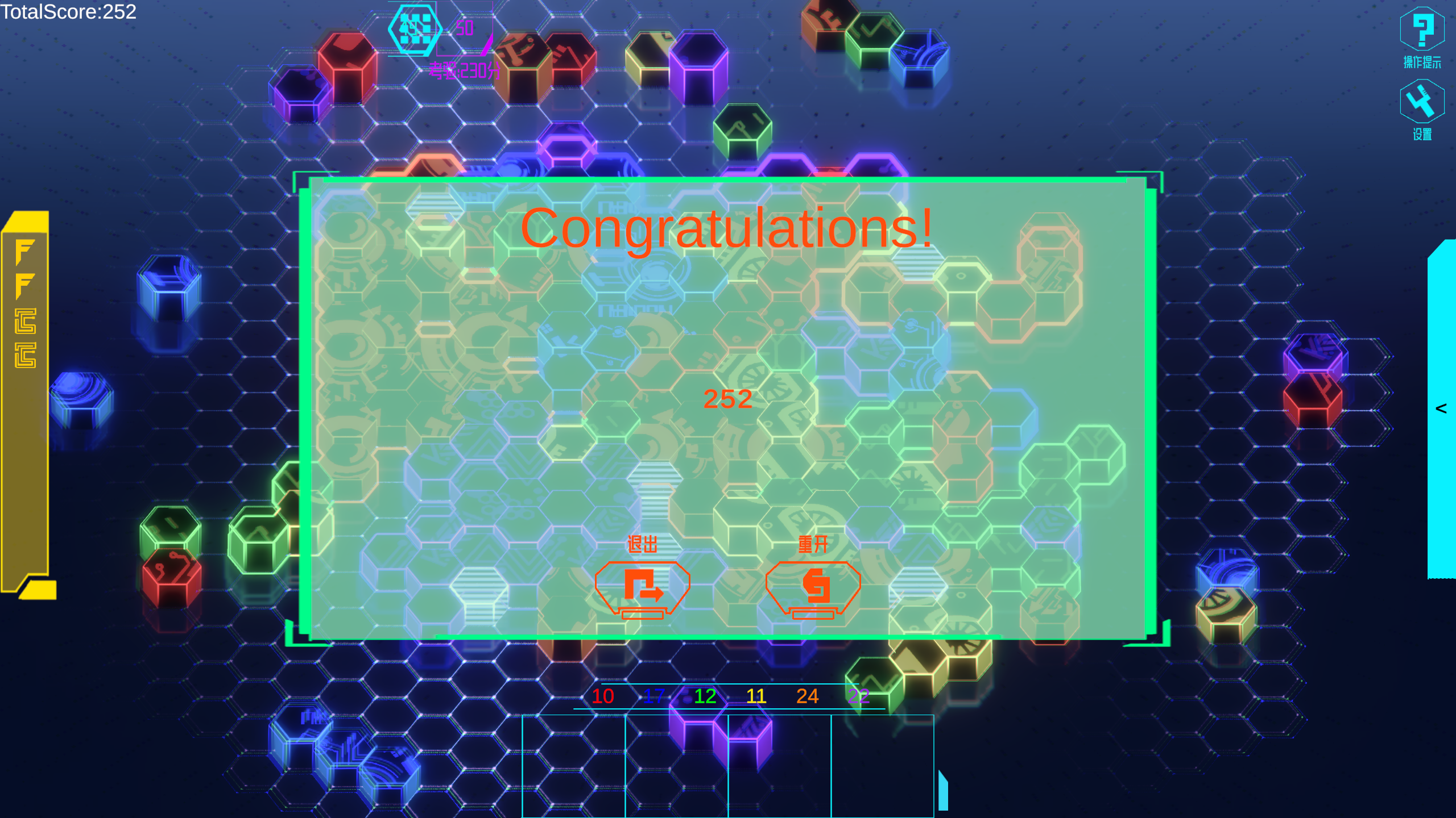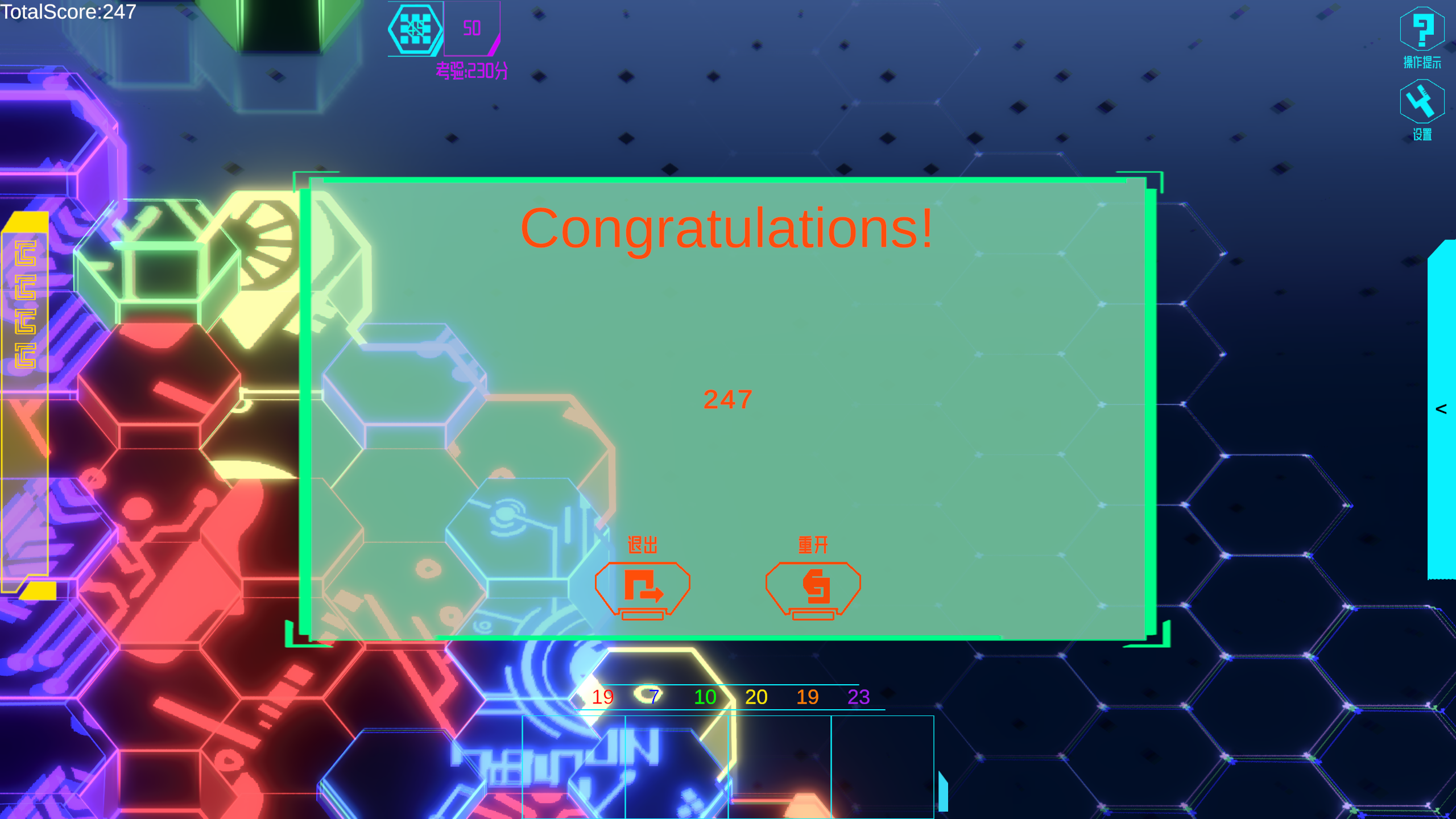美术上以多六边形为主,各种颜色的六边形很漂亮,不过感觉不是很推荐用说明书来引导玩家哈哈,很不错滴休闲游戏