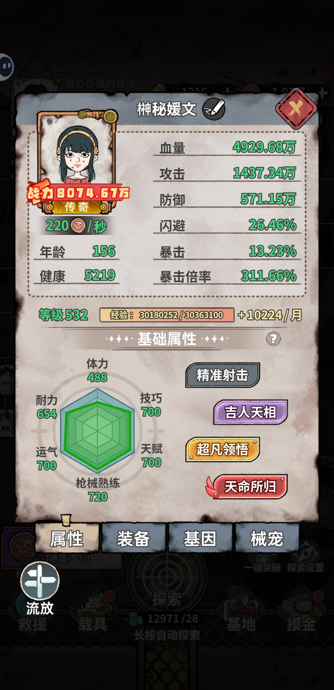 以角色养成为主,单个角色有等级、装备、基因、械宠几条养成线,其中装备槽位八个,不是很好获得。等级通过放置和探索获得经验值升级,到一定阶段可以突破,金色突破相当费钱,几乎是个无底洞,摸金看广告五倍收益也很快就用光。生娃自带随机属性词条,可以看广告进行重置,首次广告免看。