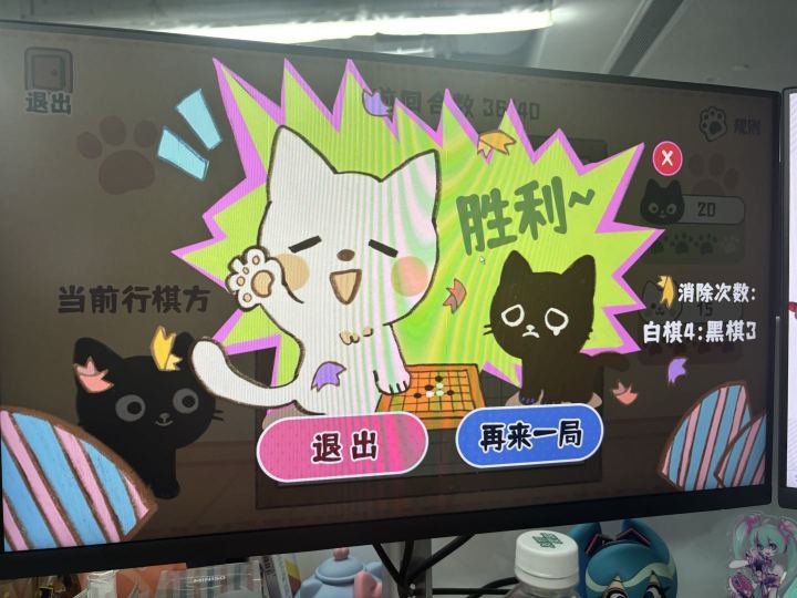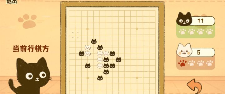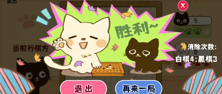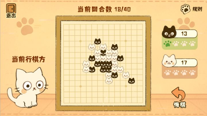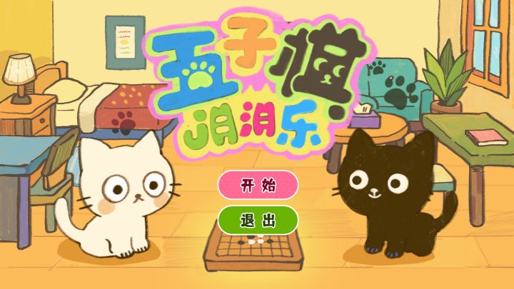 2D卡通画风,黑白两只小猫造型很可爱,第一眼印象很好,两个颜色也代表了两种棋子,结合得很恰当。棋盘中的棋子也是小猫头像,看起来可可爱爱,如果真的有这样的棋子,估计会卖得不错。
