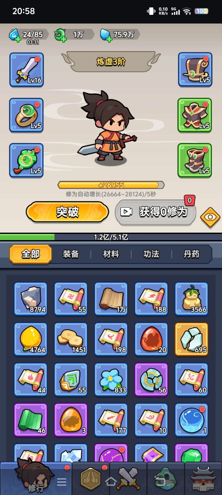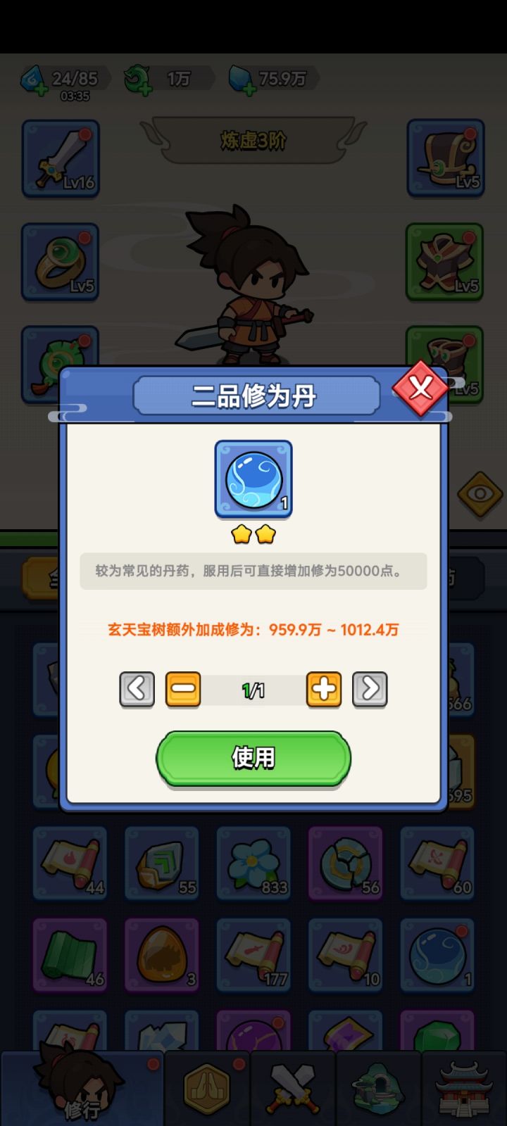 优先升级玄天宝树,吃修为丹额外获得修为。这游戏就是闯关挂机休闲游戏,但是无论干什么几乎都要看广告,游戏的一大半时间都在看广告。但凡你游出个免广告卡或者限时免广告卡,玩的都不会那么难受。开服以来看了3天的广告,炼虚了
